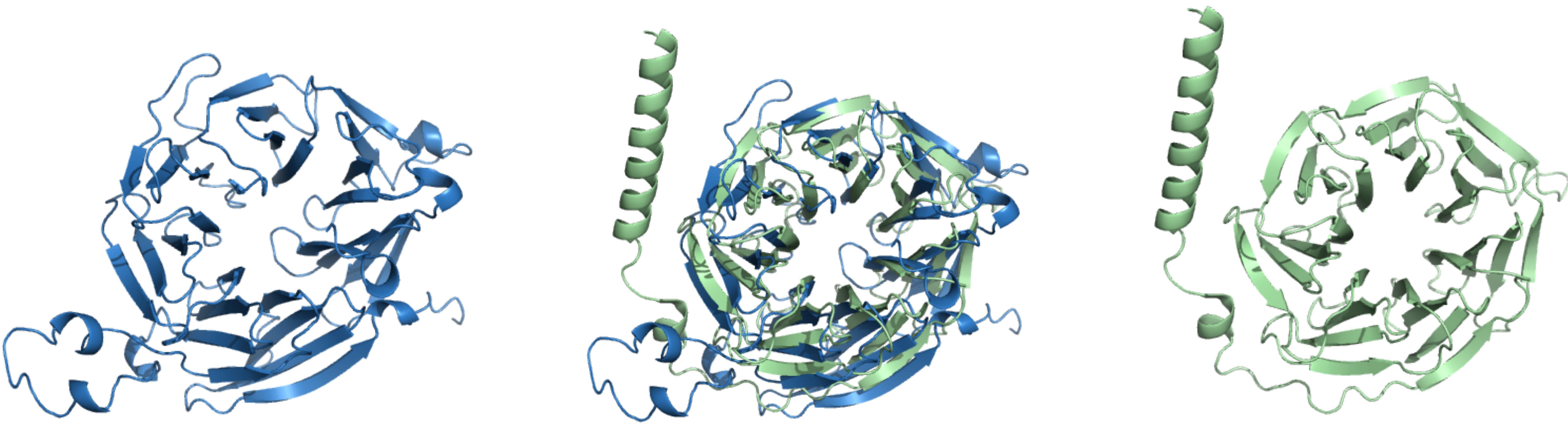 3D structures of WDR45 (blue, left) and GNB1 (green, right), with their structural alignment shown in the center.