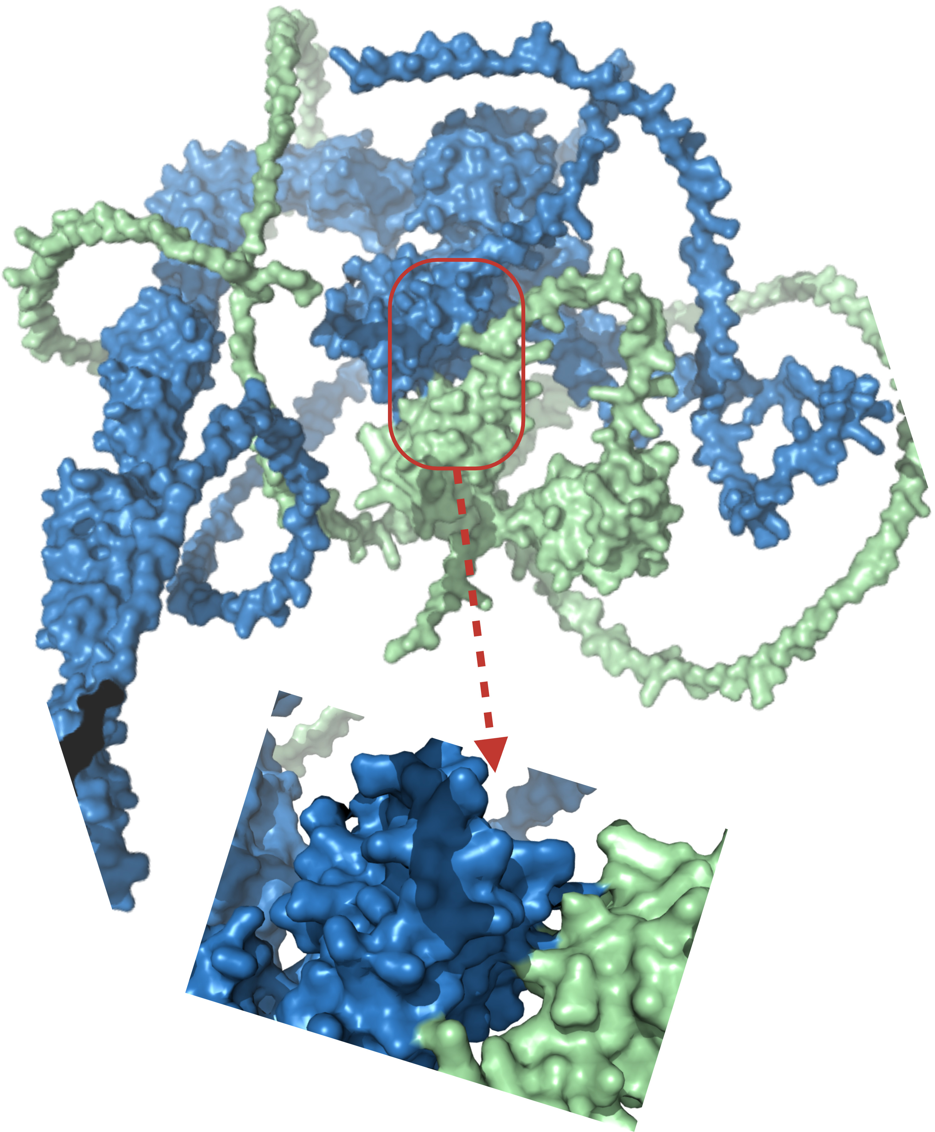 Predicted structural interaction between DCDC2 (green, UniProt ID: Q9UHG0) and KIAA0319 (blue, UniProt ID: Q5VV43) using AlphaFold 3 (v3.0.1; https://github.com/google-deepmind/alphafold3).