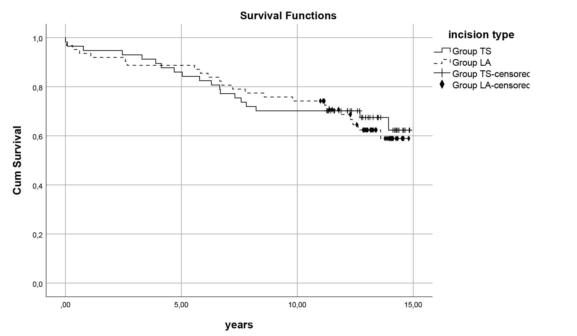 From January 2010 through February 2014, 1214 patients underwent mitral valve surgery at the SBÜ Kartal Kosuyolu High Specialization Training and Research Hospital. Left atrium diameter on 2-dimensional (2-D) echocardiography defined in 119 patients who had small left atrium and met the inclusion criteria were enrolled in the study, of which 57 patients (47.9%) underwent transseptal atriotomy (Group TS), while 62 patients (52.1%) underwent a left atriotomy (Group LA). Data was retrospectively collected. Long-term analyses were performed based on survival. The mean follow-up duration was 10.7 ± 4.2 years.