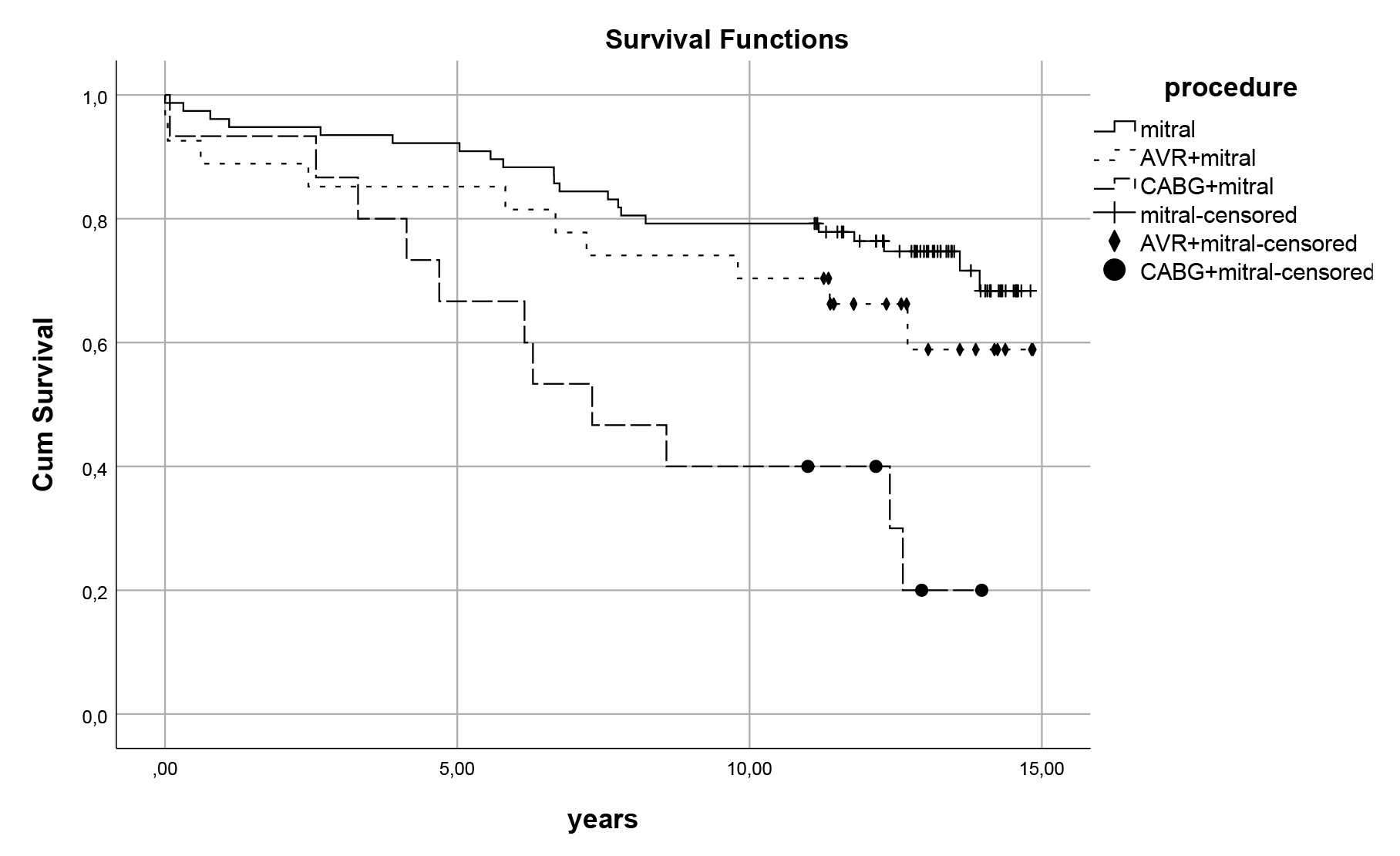 Isolated mitral procedures were performed in 49 patients (41.2%). Concomitant tricuspid valve surgery was performed in 42 patients (35.3%), concomitant aortic valve surgery in 24 patients (20.2%), and concomitant coronary artery bypass grafting in 15 patients (12.6%). The procedure rates were comparable in both Groups (p > 0.05). There was no significant difference in pre-operative variables. Ischemic time and total perfusion time were found to be similar in the Group TS vs. Group LA (87.6 ± 33.5 vs. 77.4 ± 27.8 minutes and 117.2 ± 38.4 vs. 112.3 ± 33.8 minutes respectively; p > 0.05). New-onset arrhythmia was higher in the Group TS but did not reach statistical significance (26.3% vs. 19.4%; p = 0.5). The rate of permanent pacemaker insertion was similar (5.3% vs. 4.8%; p = 0.9). Follow-up was completed in all cases and survival rate was 64.7% (64 ± 7% in Group TS vs. 58 ± 7% in Group LA; p > 0.05). Log rank analyses shows similar survivals (Group TS: 11.7 ± 0.6 years, 95% CI: 10.5–12.9; Group LA: 11.8 ± 0.6 years, 95% CI: 10.6–12.9; p > 0.05). In the multivariate Cox regression analysis, age, obesity, procedure type, and left ventricular dysfunction were found to be independent risk factors for late mortality. Regardless of tricuspid valve surgery, concomitant coronary artery bypass grafting (CABG) had worse survival compared to isolated mitral procedures and concomitant aortic valve replacement (AVR) (12.5 ± 0.5 years for mitral, 11.4 ± 1 years for concomitant AVR, and 8.2 ± 1.2 years for concomitant CABG; p < 0.01).