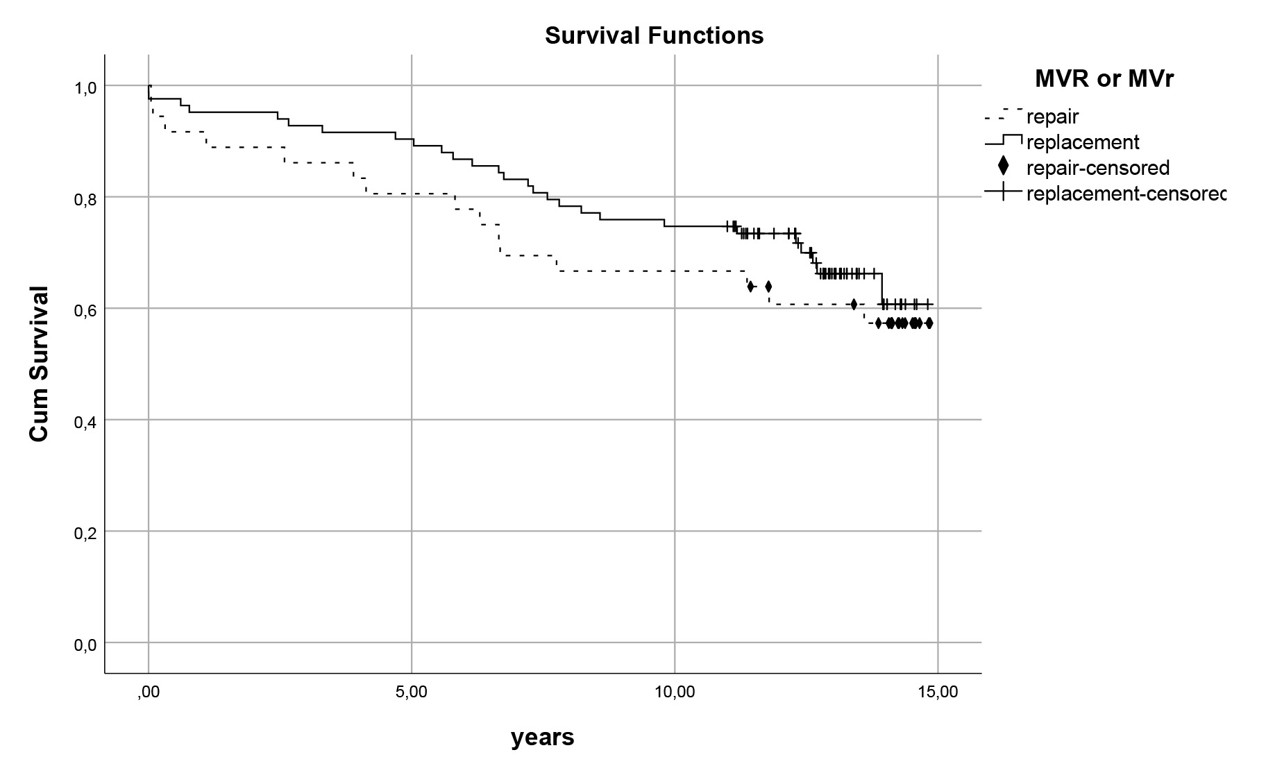 Fig. 3. Survival curves for mitral repair vs. replacement. Comparison of late survival of patients who had mitral valve repair (MVr) versus replacement (MVR) (p