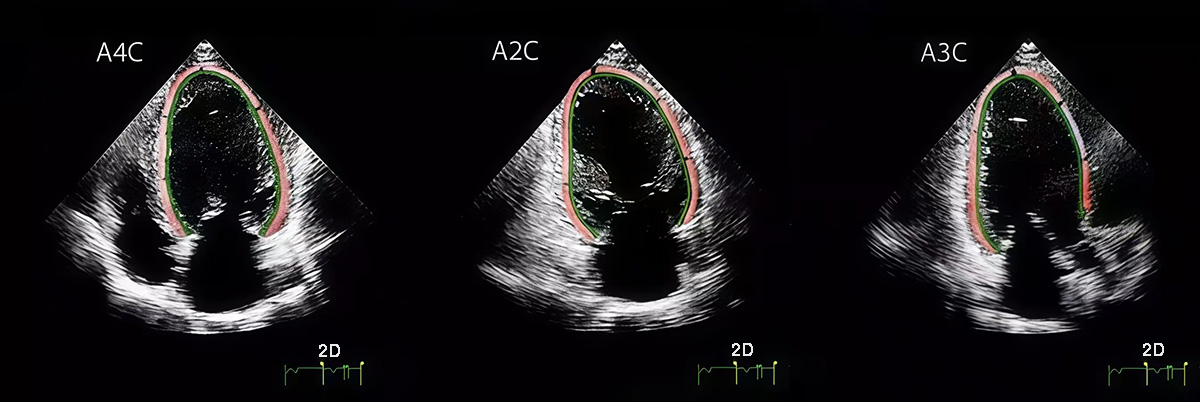 Fig. 2. LVGLS was obtained by analyzing standard A4C, A2C, and A3C views using Qlab strain analysis and calculated from these three views. LVGLS, LV global longitudinal strain; A4C, apical 4-chamber; A2C, apical 2-chamber; A3C, apical 3-chamber. The red and green lines represent the LVGLS sampling lines along which data were collected.