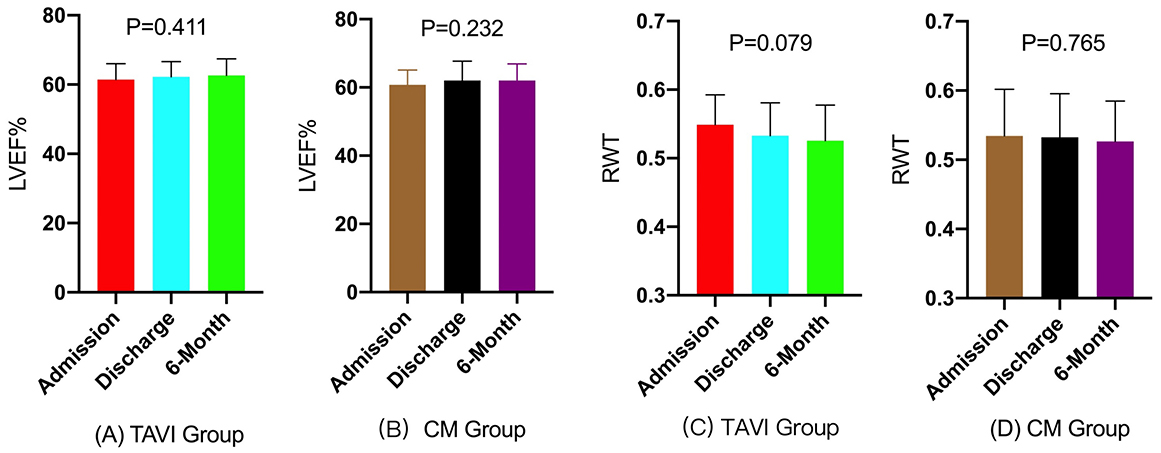 LVEF, RWT, and LVGLS were assessed across three time points (admission, discharge, and 6-month follow-up) using repeated-measures analysis of variance (ANOVA) to evaluate longitudinal changes within each treatment group.