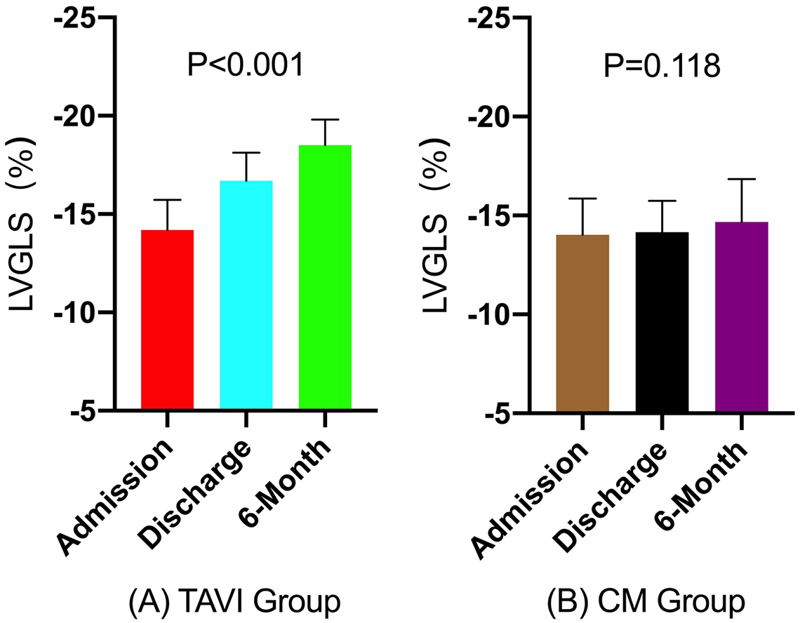 Fig. 4. Bar graphs of longitudinal changes in LVGLS. (A) TAVI group, (B) Conservative management group (CM). LVGLS in the TAVI group significantly improved at discharge and 6-month follow-up compared to baseline (p