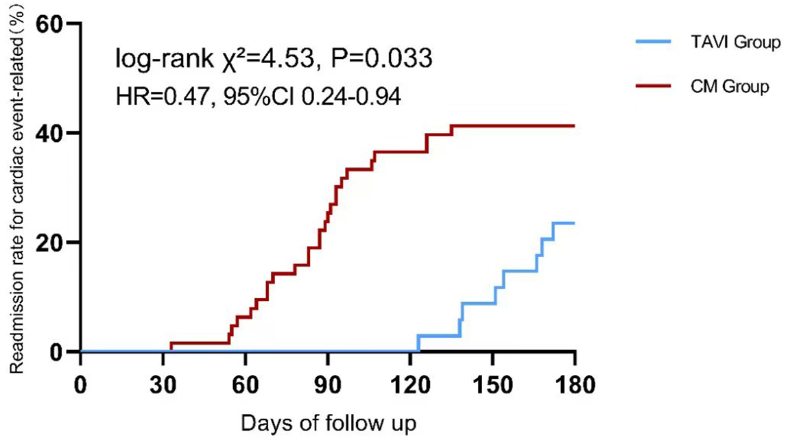 During the 6-month follow-up period, no mortality was observed in either cohort. However, there were 8 cardiac event-related readmissions in the TAVI group, compared to 26 in the conservative management group. Kaplan-Meier analysis with log-rank test confirmed a significantly lower cumulative incidence of cardiac event-related readmission in the TAVI group compared to the CM group (