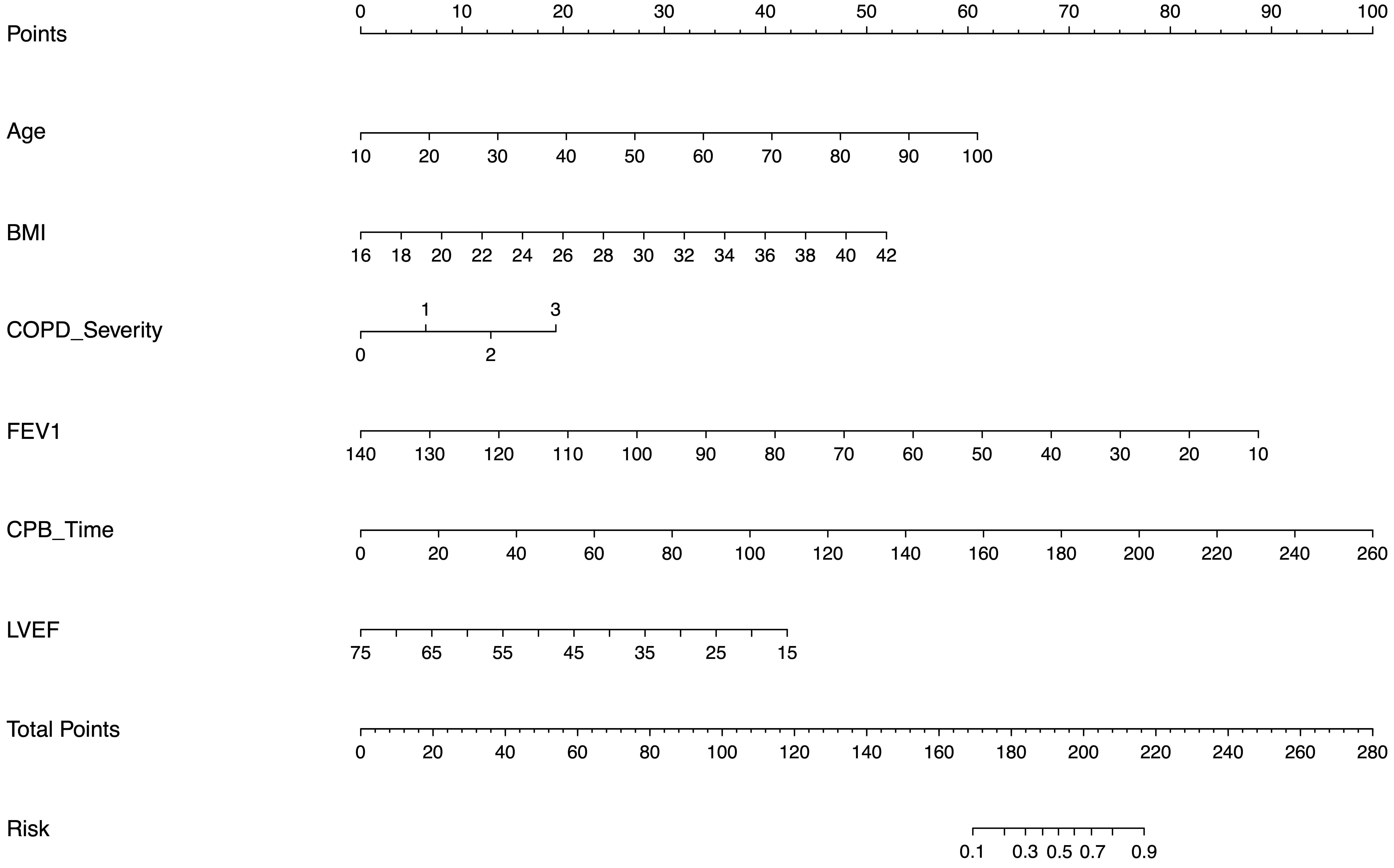 Fig. 2. Multivariable nomogram for predicting postoperative mechanical ventilation risk. The visual scoring tool incorporates six independent predictors: age (per 1-year increase), body mass index (BMI; per 1 kg/m2 increase), chronic obstructive pulmonary disease (COPD) severity (per 1-grade increase), predicted forced expiratory volume in 1 second (FEV1%; per 1% increase), left ventricular ejection fraction (LVEF%; per 1% decrease), and cardiopulmonary bypass (CPB) time (per 10-minute increase). The total score points correspond to the patient-specific probability of requiring mechanical ventilation for
