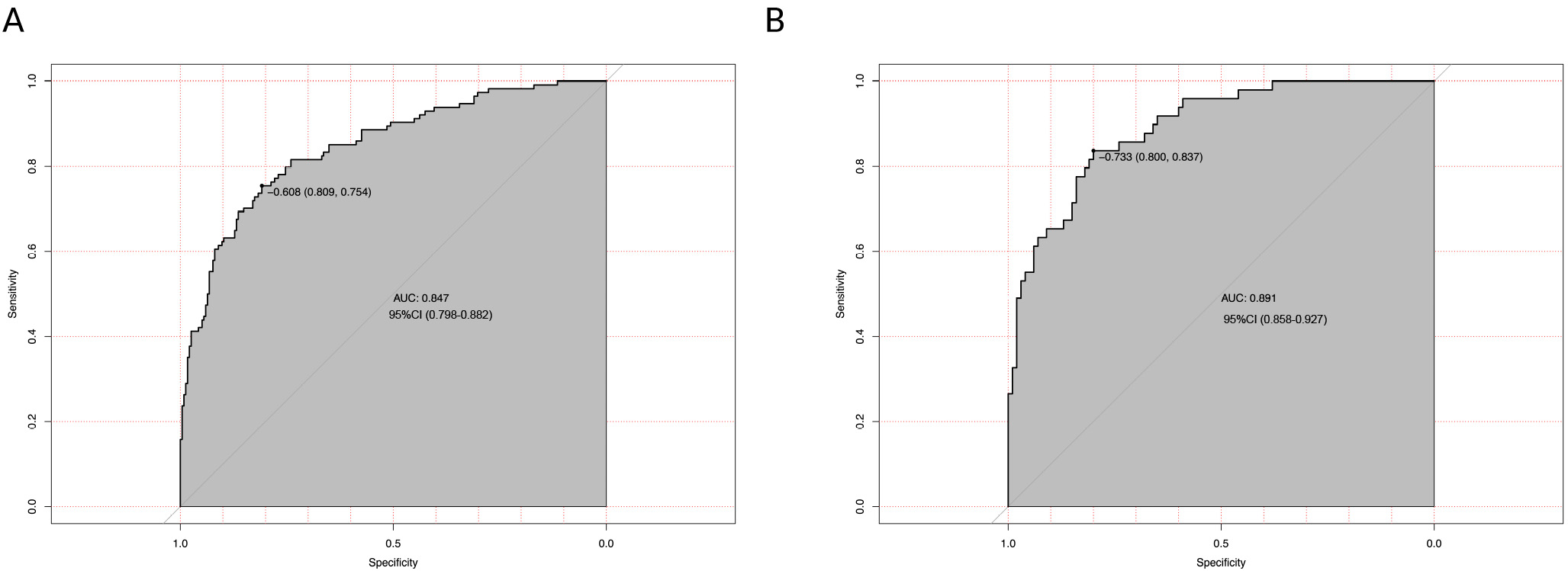 Fig. 4. Receiver operating characteristic (ROC) curves evaluating the discriminatory performance of the prediction model for prolonged mechanical ventilation (PMV). (A) In the derivation cohort (training set, n = 349), the model achieved an area under the curve (AUC) of 0.847 (95% CI: 0.798–0.882), indicating excellent discrimination between patients requiring PMV and those extubated within 48 hours. (B) In the internal validation cohort (n = 149), model performance remained high, with an AUC of 0.891 (95% CI: 0.858–0.927). The diagonal reference line indicates chance-level prediction. PMV was defined as mechanical ventilation lasting