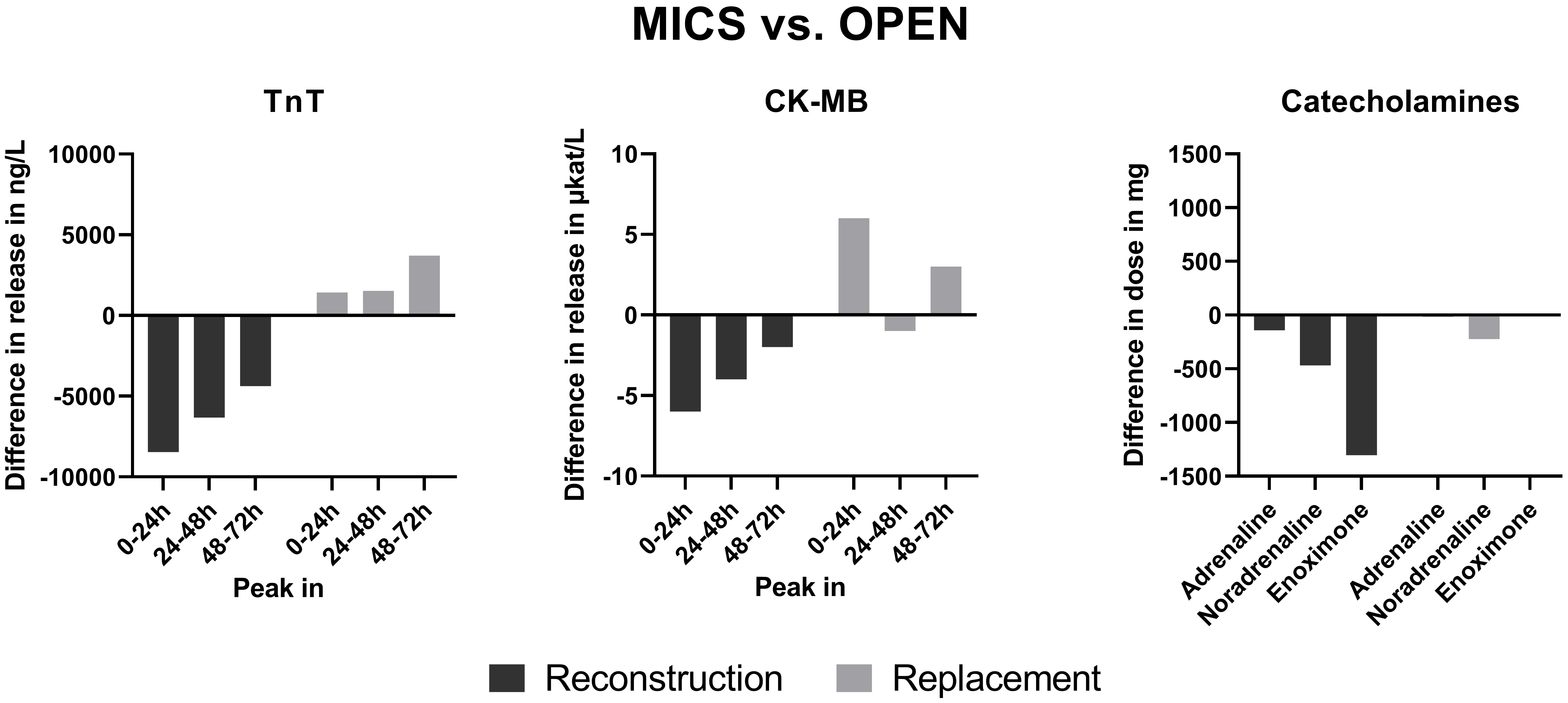 The peak TnT release in the first (p = 0.025) and second 24 h interval (p = 0.046), as well as the TnT AUC in the first 24 h (p = 0.024), were lower in the MICS group with reconstruction. The peak CK-MB release was relevantly lower in the first (p = 0.093) and third 24 h period (p = 0.067), as well as the CK-MB AUC between 48 and 72 h (p = 0.055). However, the peak release and AUC for TnT and CK-MB did not differ between MICS and OPEN in the replacement population. The noradrenaline dosage was lower (p = 0.023) for MICS in the replacement population. In the reconstruction population, the dosage of adrenaline (p = 0.036), noradrenaline (p = 0.043), and enoximone (p = 0.012) was lower in the MICS group than in the OPEN group.