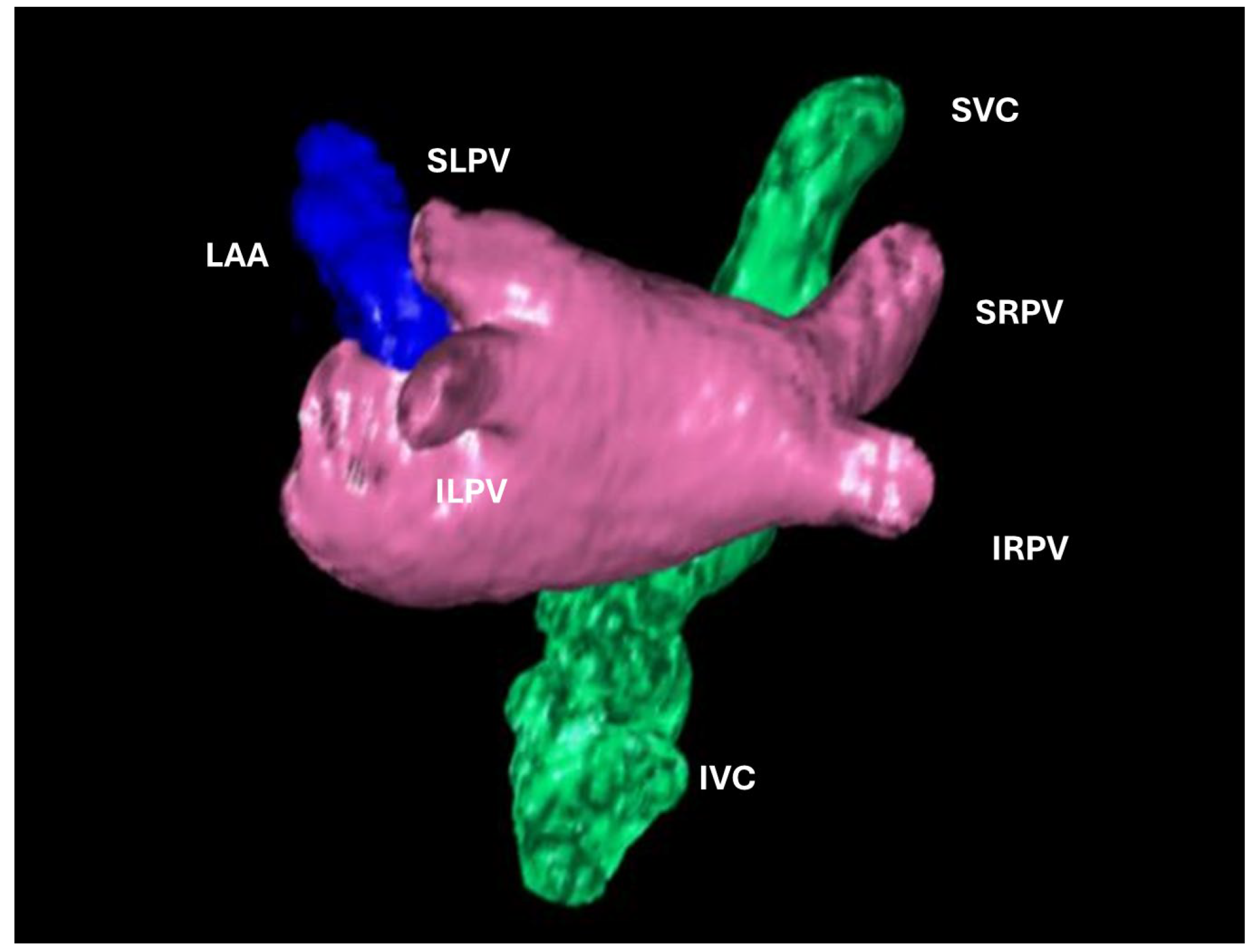 Fig. 1. 3D volume rendering of the left atrium (LA). left atrial appendage (LAA), pulmonary veins (SRPV, superior right pulmonary vein; IRPV, inferior right pulmonary vein; SLPV, superior left pulmonary vein; ILPV, inferior left pulmonary vein), superior vena cava (SVC) and inferior vena cava (IVC).