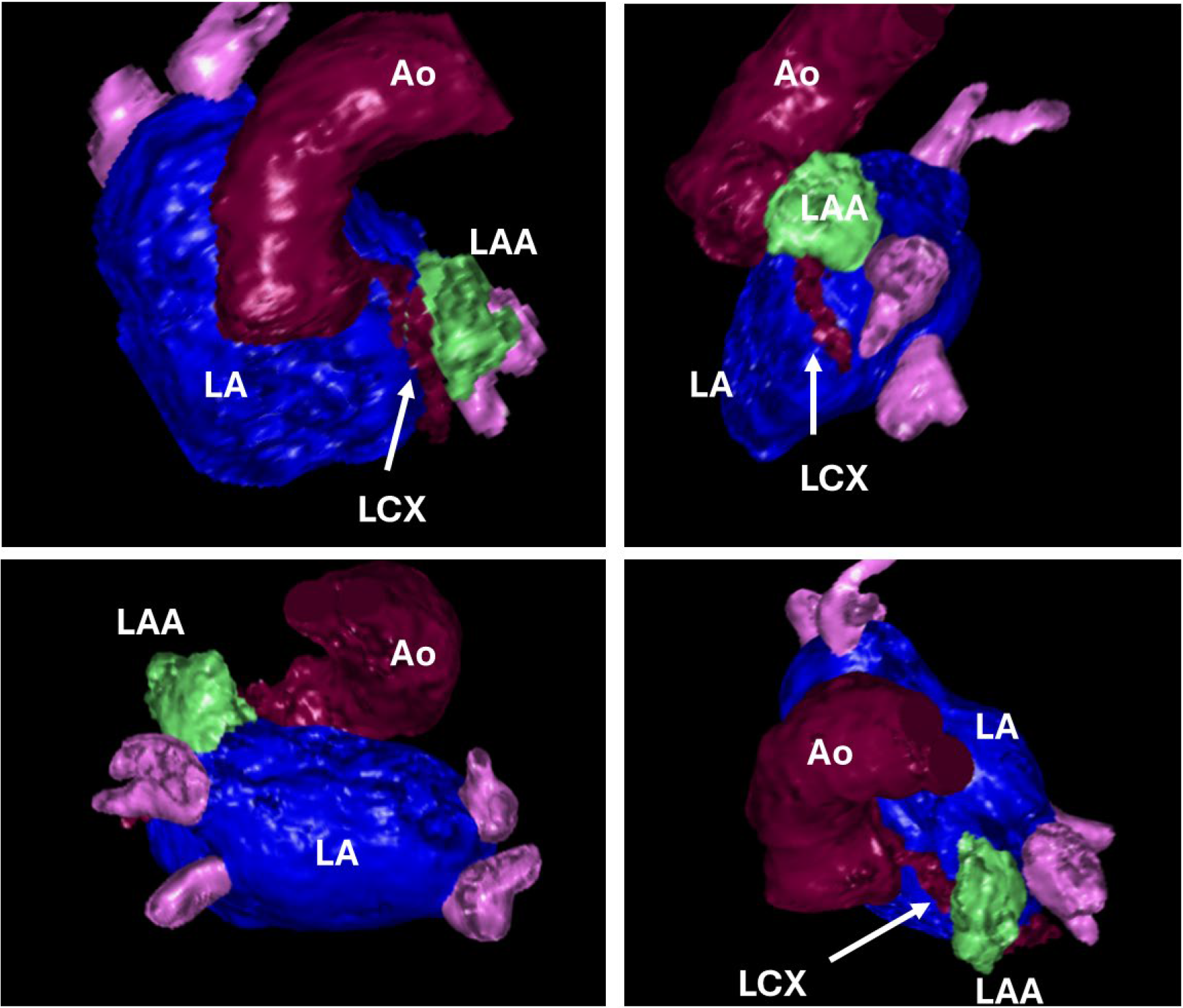 Fig. 2. 3D volume rendering of the left atrium (LA), left atrial appendage (LAA), ascending aorta (Ao) and left circumflex artery indicated with an arrow (LCX).