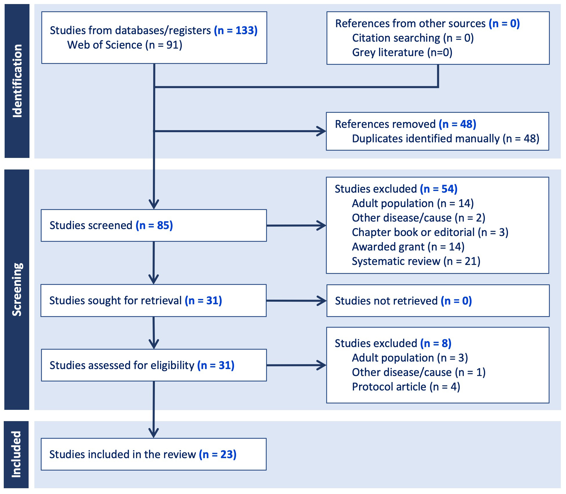 The search was from 2015 to 2024. From the 133 identified articles, 85 were eligible after removing duplicates (48 articles). A two-stage screening process was applied, where all eligible studies were initially screened by title and abstract (31 studies were eligible). Then, the full text was reviewed (23 articles were eligible) (Fig. 1).