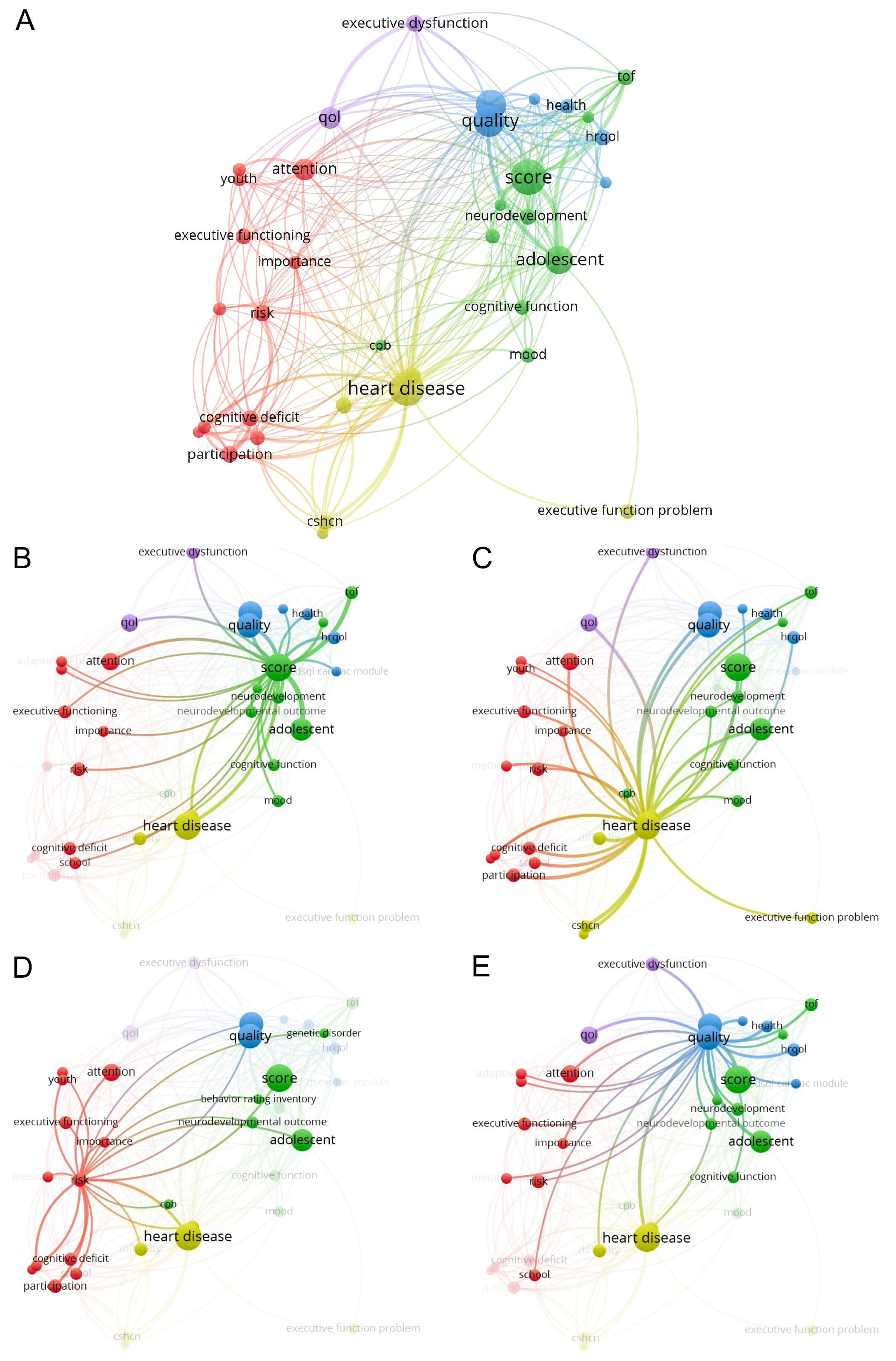 Fig. 2. Network maps of term co-occurrences in the selected articles. (A) Network map of terms in the title and abstract; nodes and links of every cluster of terms are represented in different colors. Details of clusters: score (B), heart disease (C), attention (D), quality (E). CSHCN, children and adolescents with special healthcare needs and heart disease; HRQOL, health-related quality of life; QOL, quality of life.