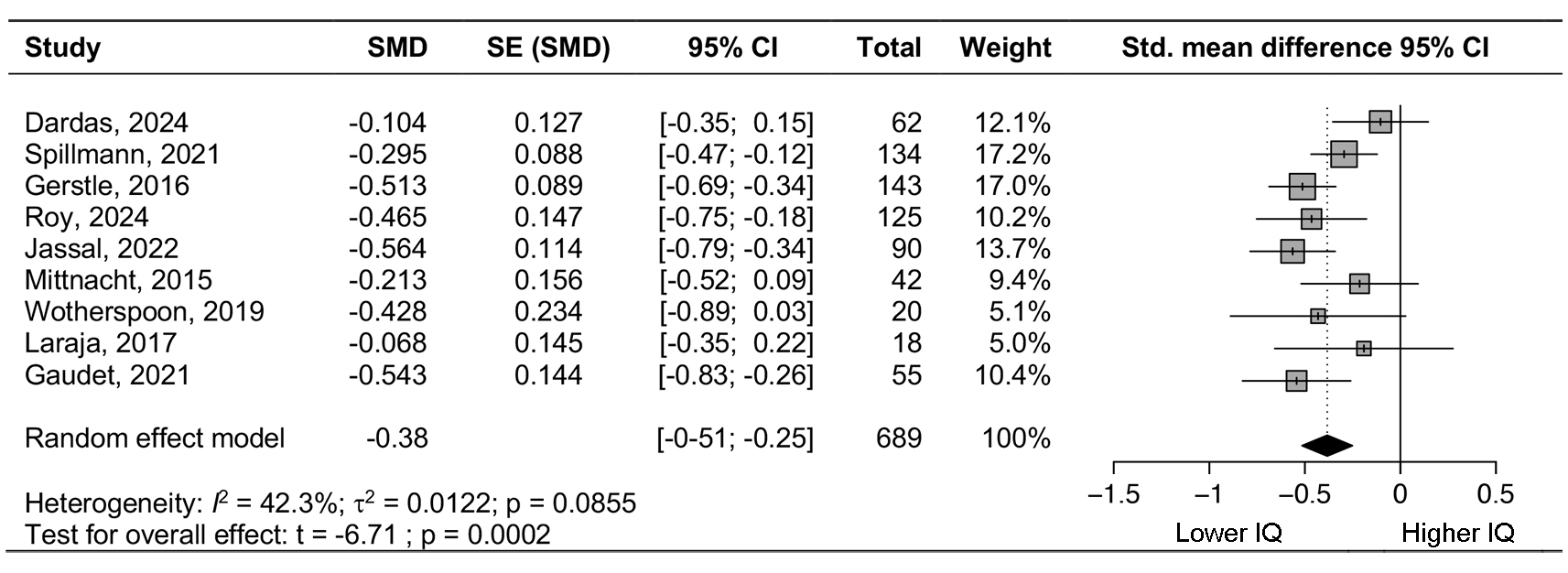 Fig. 3. Forest plot total IQ. IQ, intelligence quotient; SMD, standardized mean difference; CI, confidence interval; SE, standard error.