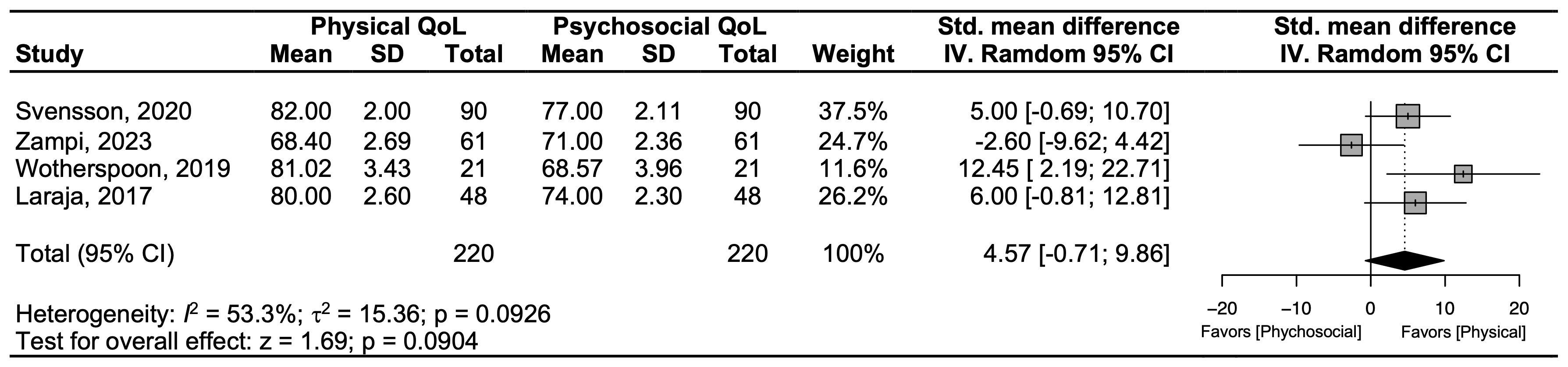 Fig. 4. Forest plot of physical and psychosocial quality of life values. QoL, quality of life; SD, standard deviation; IV, inverse variance.