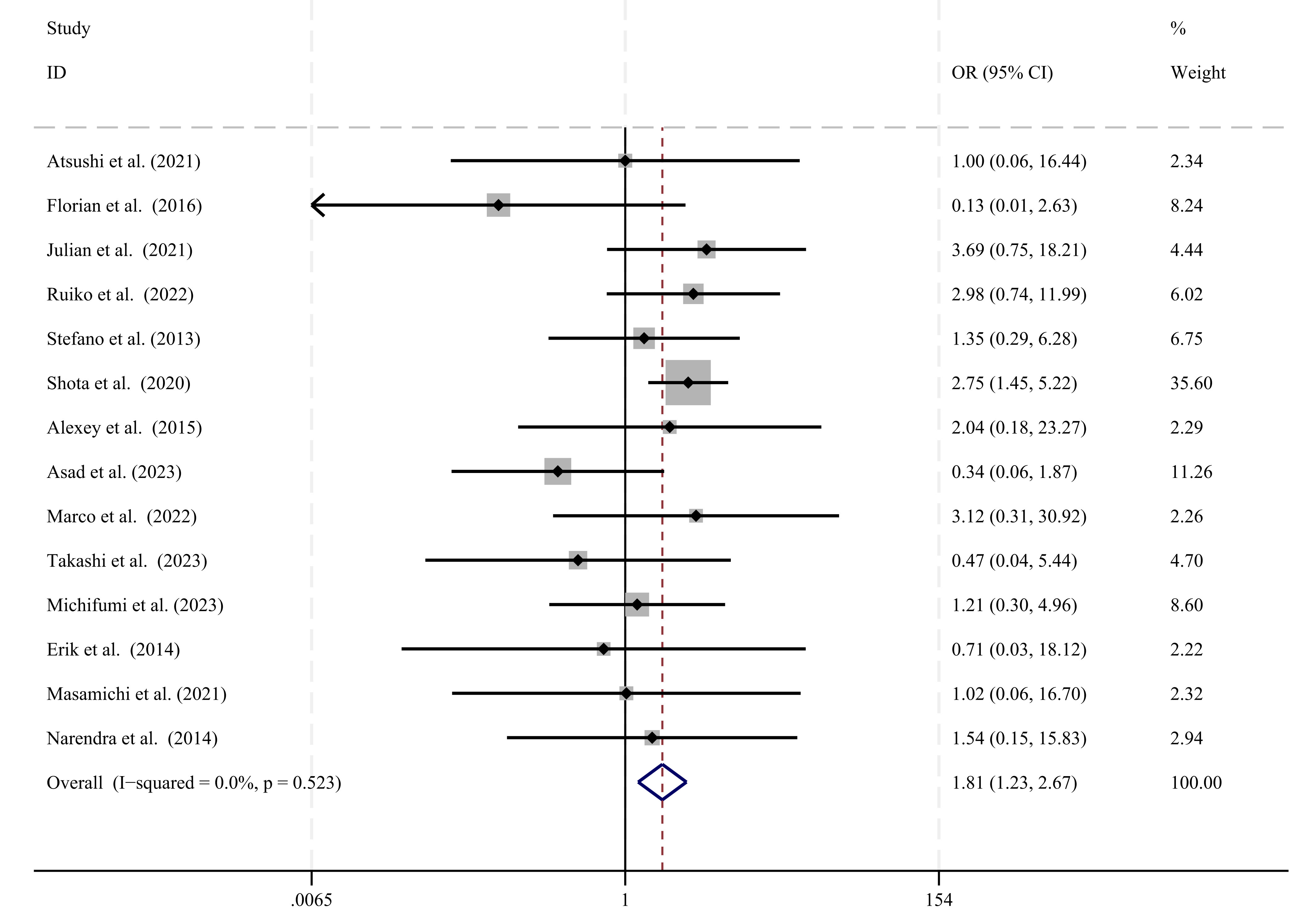 Fourteen studies [1, 10, 15, 18, 20, 21, 22, 24, 25, 26, 27, 28, 29, 30] investigated PNP. These studies showed no significant differences, as indicated by an I2 of 0.0%. Therefore, a fixed-effect model, which assumes a single true effect size across studies, was used for the meta-analysis. These results indicated a significantly higher rate of PNP in the CBA group compared to the LBA group (OR: 1.81, 95% CI: 1.23–2.67, p = 0.003; I2 = 0.0%). See Fig. 3 for more details.
