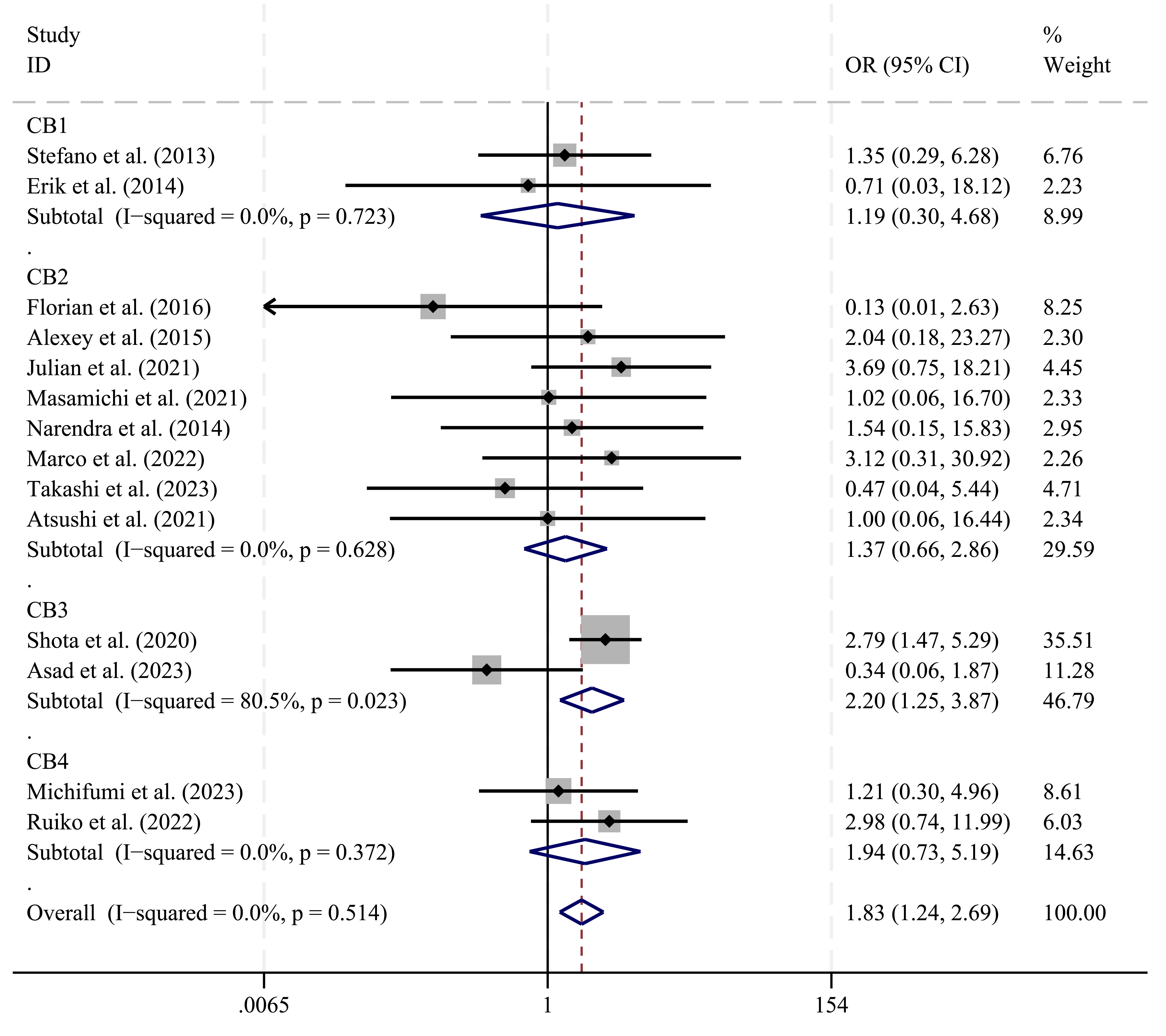 Fig. 4. Forest plot of the subgroup analysis of PNP in groups CB1–4. OR, odds ratio; 95% CI, 95% confidence interval; PNP, phrenic nerve paralysis; CB, cryoballoon.