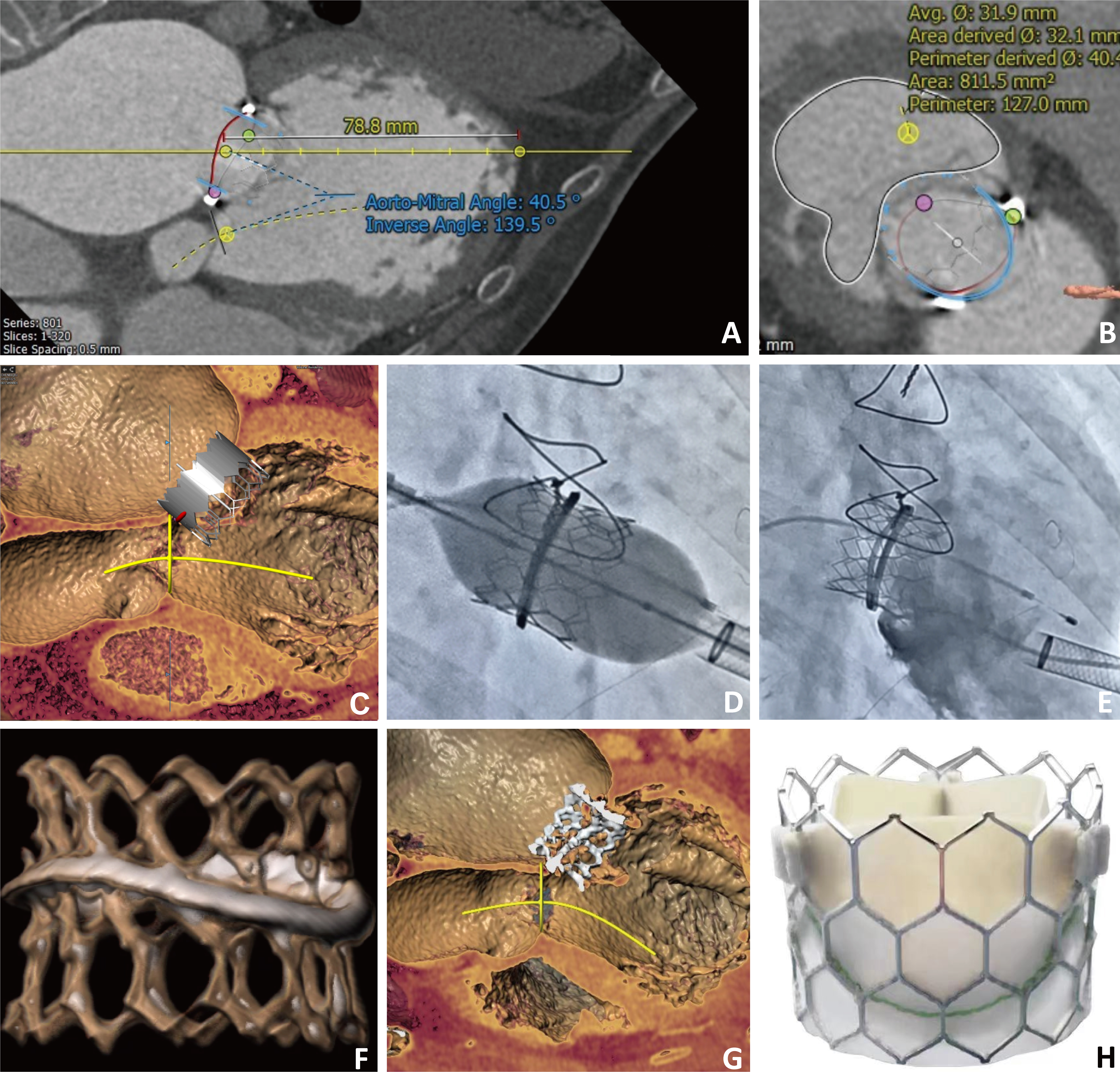 Fig. 1. Imaging evaluation of Renato valve implantation in mitral valve-in-ring. (A) Preprocedural computed tomography (CT) scan showed that the aortomitral angle was 40.5°. (B) A CT-simulated 27 mm Renato valve was implanted. The estimated neo-left ventricular outflow tract (LVOT) was 811.5 mm2, and no LVOT was observed. (C) Simulated valve implantation in the left ventricular long-axis view. (D) The fluoroscopy image of the valve expansion. (E) Angiography showed no residual mitral regurgitation. (F) Post-procedural three-dimensional reconstruction CT scan of mitral valve-in-ring (MViR). (G) Post-procedural CT scan showed no LVOT obstruction. (H) Image of the Renato valve.
