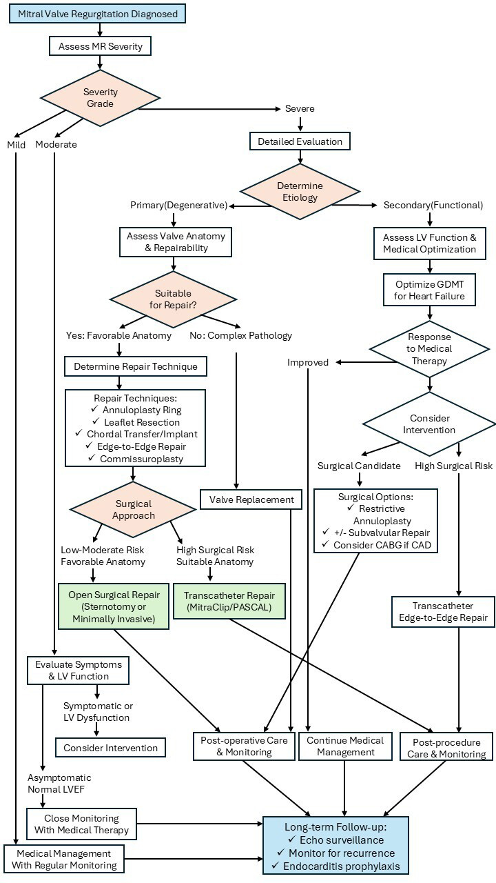 Timing of intervention remains a critical determinant of outcomes, particularly in asymptomatic patients with severe MR [78]. Current guidelines advocate for early referral for mitral repair when feasible, recognizing the superior long-term outcomes associated with valve preservation compared with replacement. However, the optimal timing of intervention in functional MR remains controversial, requiring individualized assessment of ventricular function, symptom burden, and probability of durable repair success.