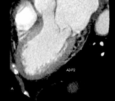 Computed tomography imaging of mitral valve prolapse (P2) and annular dimensions.