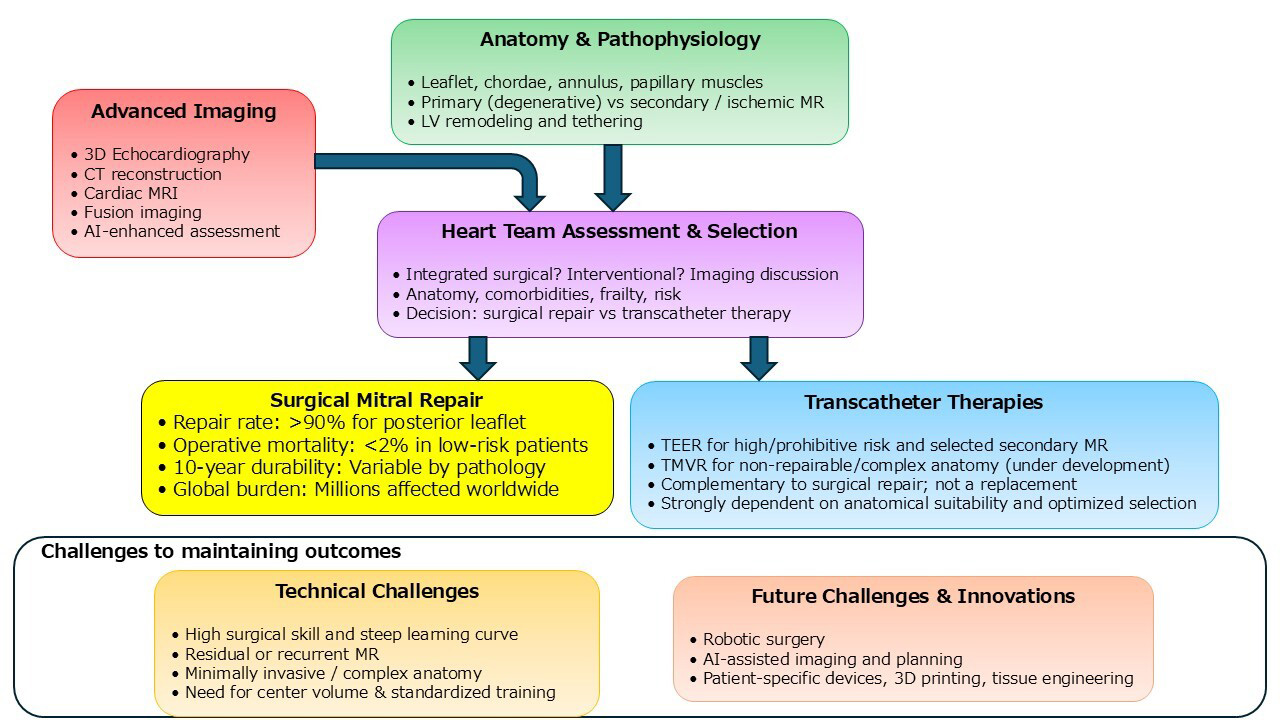 Success will depend on sustained investment in research, multidisciplinary training programs, and the establishment of centers of excellence. Regional and global collaboration, along with equitable access to education and cost-effective therapies, will be critical for advancing care worldwide. The focus remains on the evidence-based optimization of repair techniques to preserve the advantages of valve repair over replacement by delivering durable, safe, and effective mitral valve treatment for diverse patient populations.