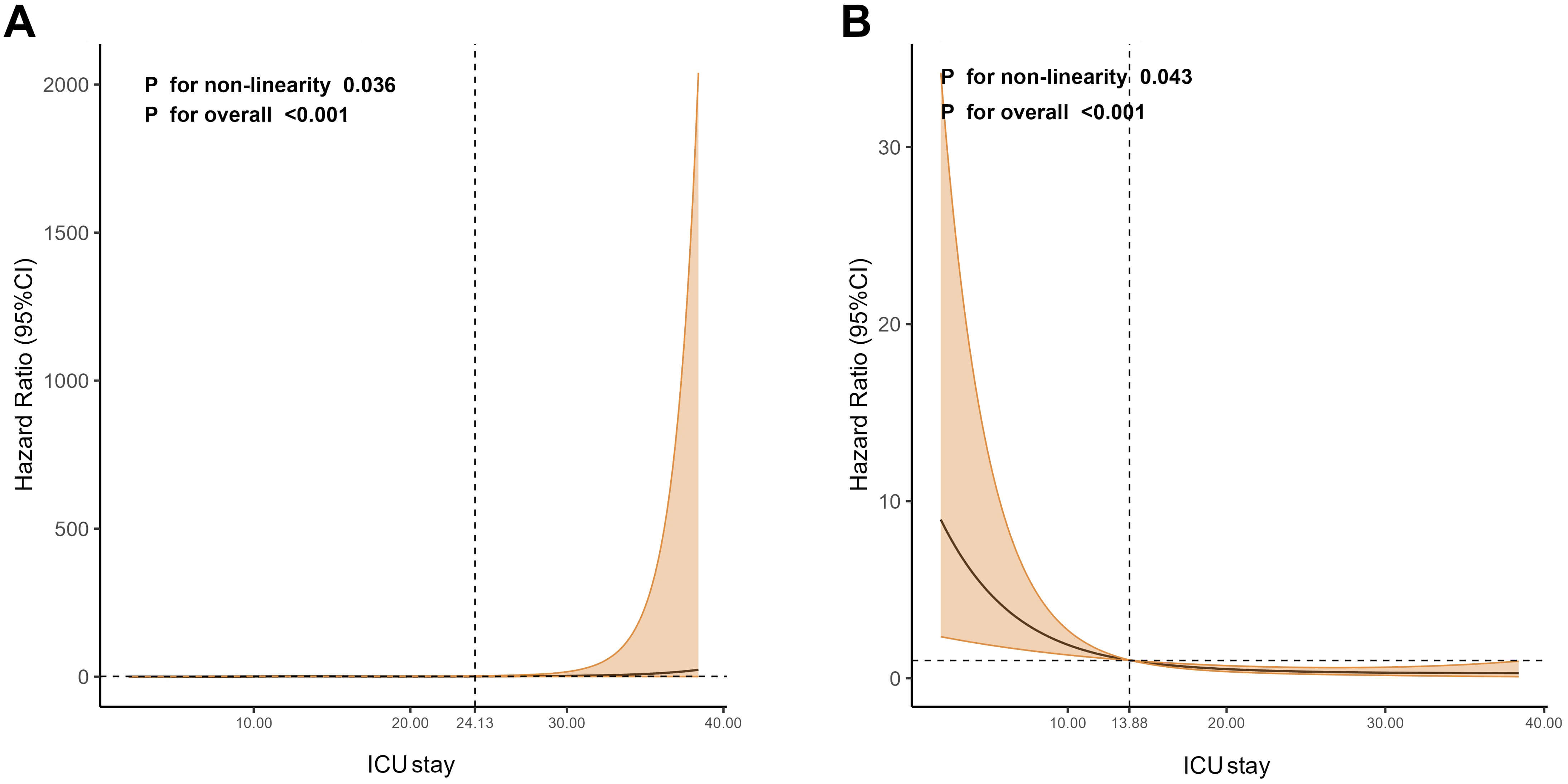 Restricted cubic spline regression analysis. (A) Nonlinear relationship between ICU stay and NIs. (B) Nonlinear relationship between ICU stay and death. ICU, intensive care unit; NIs, nosocomial infections; CI, confidence interval.