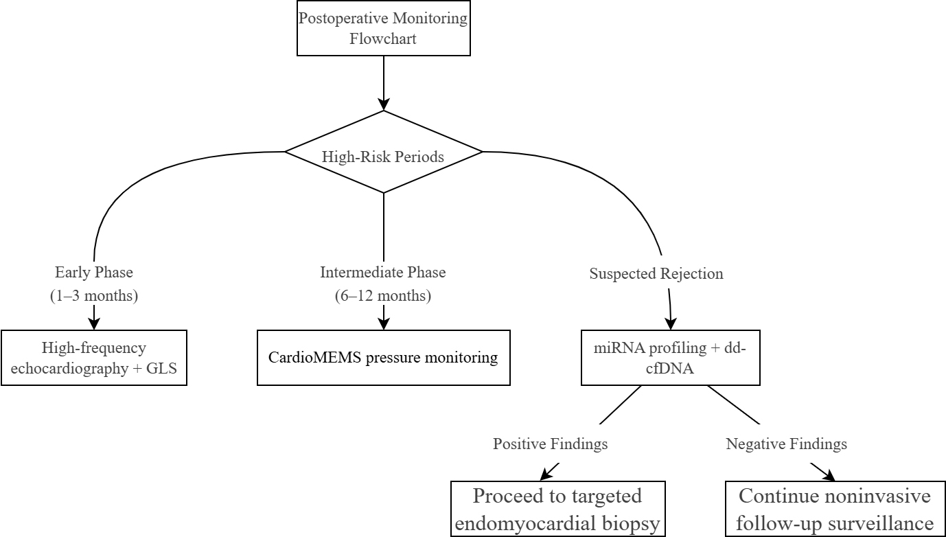 Postoperative surveillance remains a cornerstone for ensuring graft success and long-term survival following HT. Traditionally, monitoring has relied on invasive methods such as endomyocardial biopsy. However, recent advances in noninvasive imaging and biomarker technologies have transformed postoperative management, offering safer, more dynamic, and more patient-centered approaches.