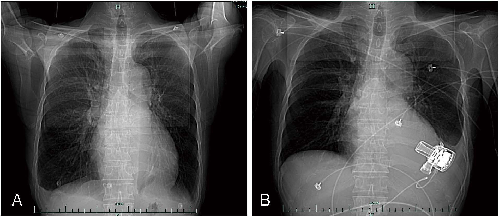 Chest computed tomography scans taken before and after surgery. (A) Before the operation. (B) After left ventricular assist device implantation.