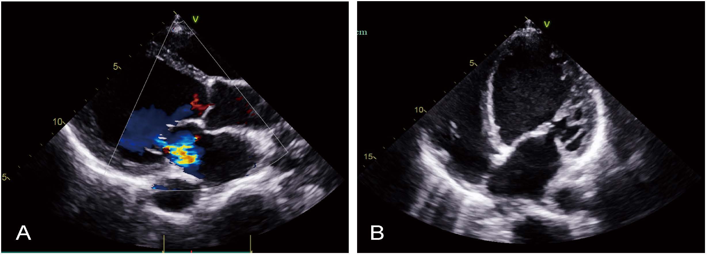 Preoperative transthoracic echocardiography. (A) Parasternal long-axis view. (B) Apical four-chamber view.