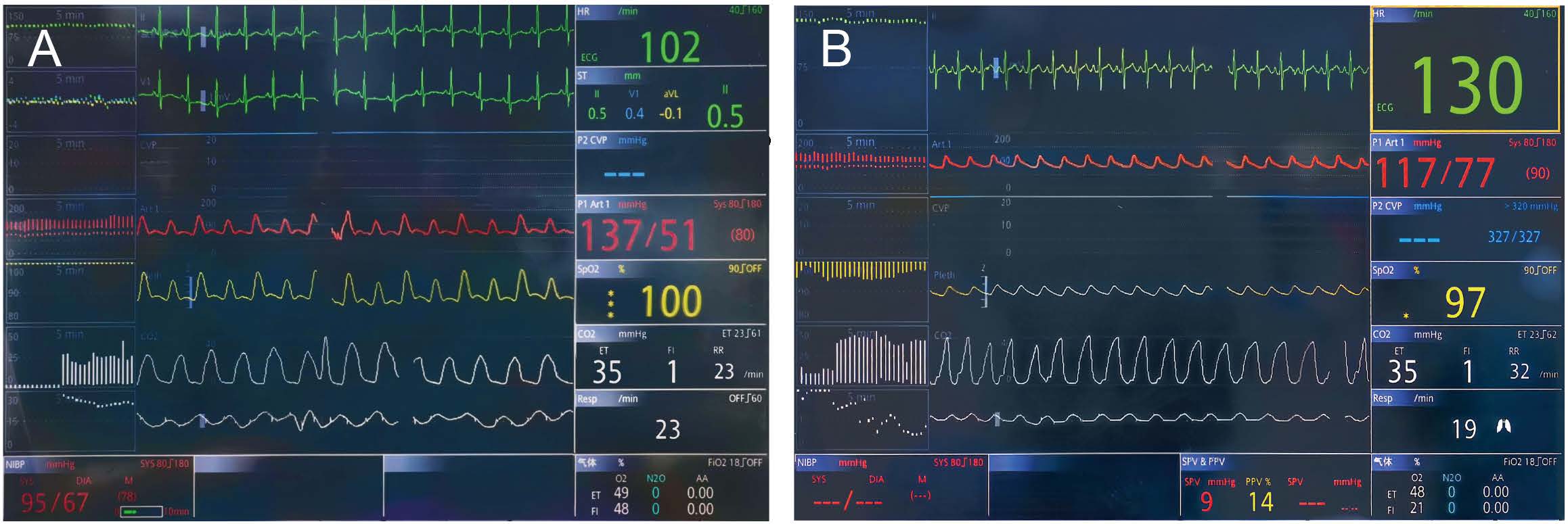 Screenshots of monitoring data. (A) Monitoring data under oxygen before anesthesia. (B) Monitoring data during oxygen inhalation via a nasal catheter after extubation.