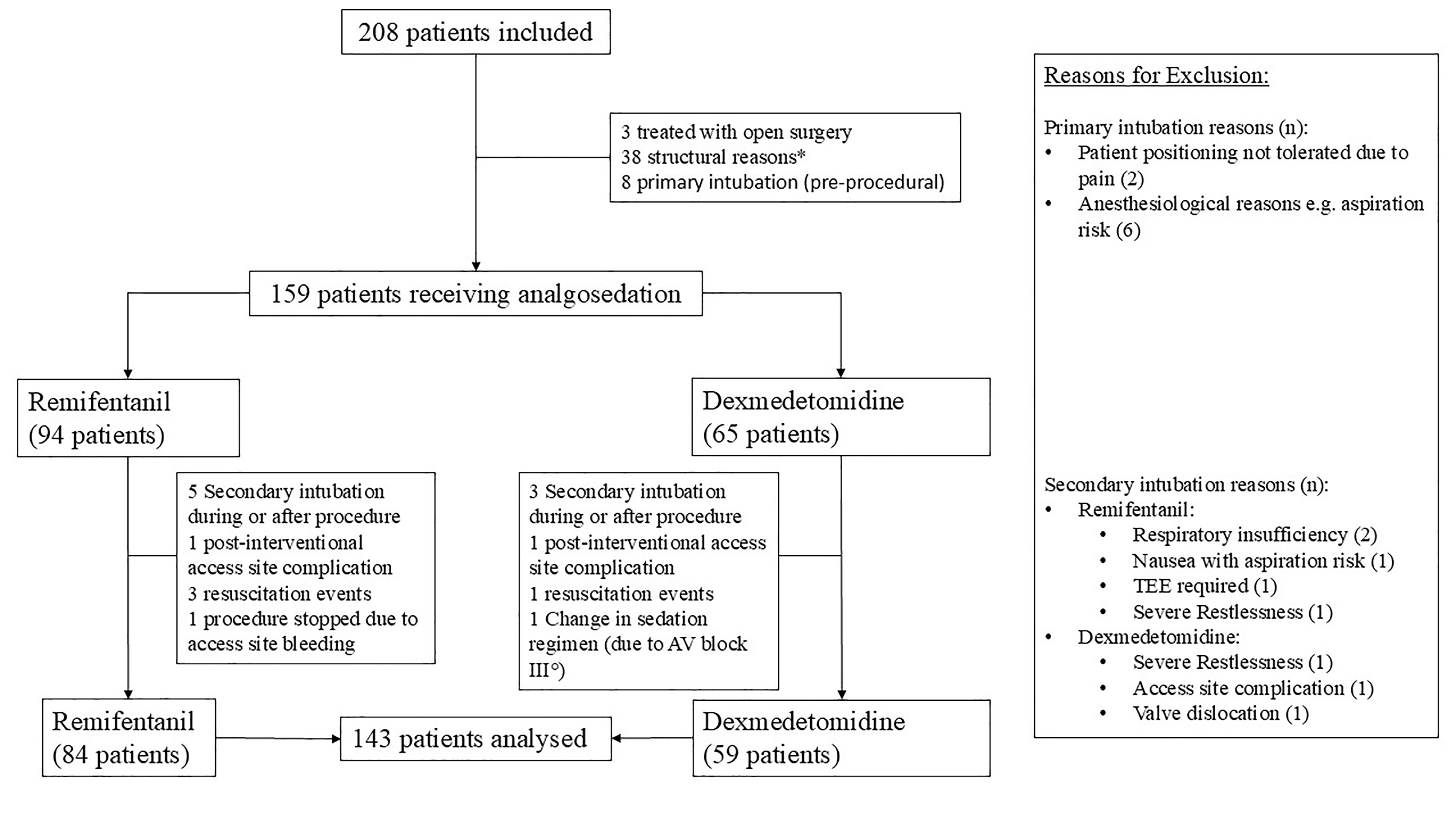 Of the 208 patients included, three underwent open-heart surgery. 38 patients could not be included for structural reasons, like missing ICU capacities. In eight other patients the intervention was performed primarily under general anesthesia for medical reasons. Intubation was required for eight additional patients for medical reasons during the intervention. Another eight patients were excluded according to the study protocol. Further information can be found in Fig. 1. The demographic data of the 143 patients are listed in Table 1. The two sedation regimen groups differed in sex composition; in the Dex group, 59% of participants were female (vs. 40% in the Remi group; p = 0.026). Furthermore, there were more patients with a history of chronic obstructive pulmonary disease (COPD) in the Dex group (15% vs. 8.3%; p = 0.2). The other parameters collected were balanced between the two groups.