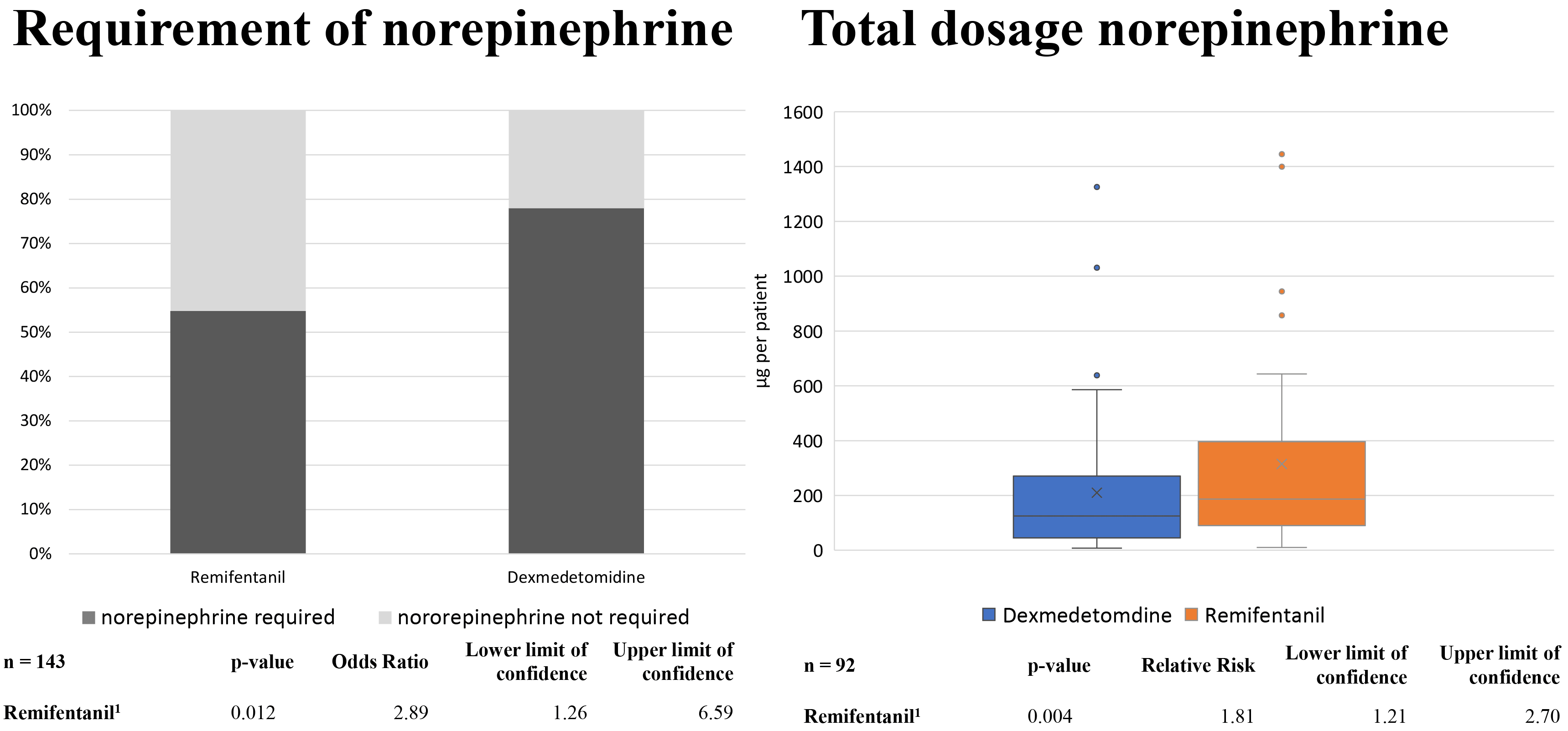 Requirement of norepinephrine (left panel) and total norepinephrine dose (right panel) during analgosedation. The total dose was only analyzed in patients requiring norepinephrine. 1 adjusted for age, sex, left ventricular ejection fraction, propofol dose, and glomerular filtration rate.