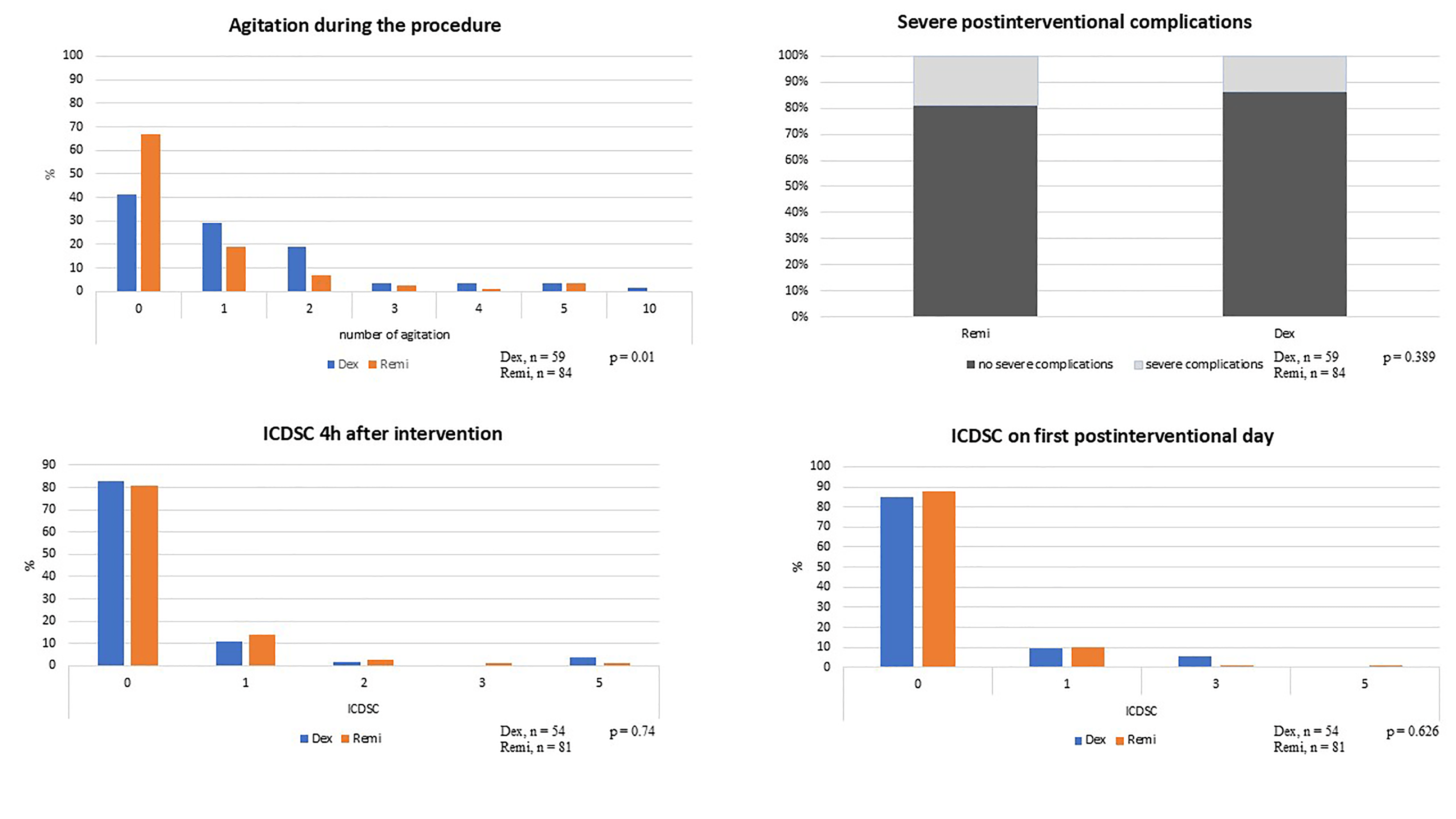 Secondary endpoints. Shown are the relative proportions of each parameter across the two groups. ICDSC scores with a value of zero were excluded from graphical representation. Abbreviations: Dex, Dexmedetomidine group; Remi, Remifentanil group; h, hours; ICDSC, Intensive Care Delirium Screening Checklist.