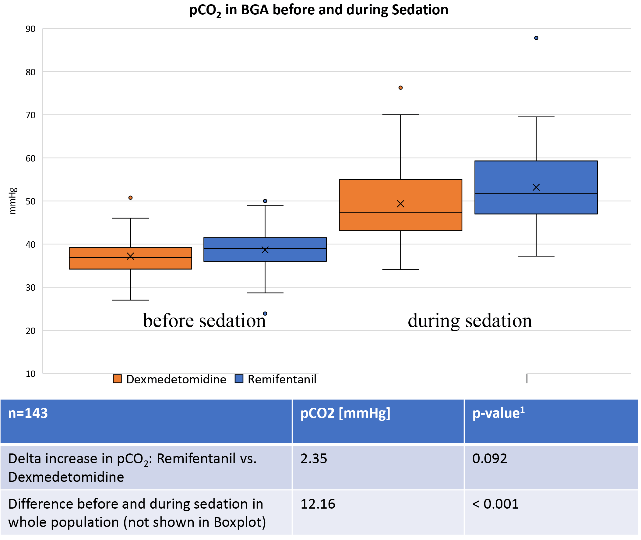 The overall increase in arterial CO2 partial pressure between the first and second blood gas analyses was 12.16 mmHg. The CO2 increase in the Remi group was 2.35 mmHg (SD 1.39) higher than in the Dex group. This difference was not statistically significant (p = 0.092; see Fig. 4).
