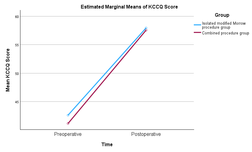 Estimated marginal means of KCCQ scores from the pre- to postoperative period, by group. KCCQ, Kansas City cardiomyopathy questionnaire.