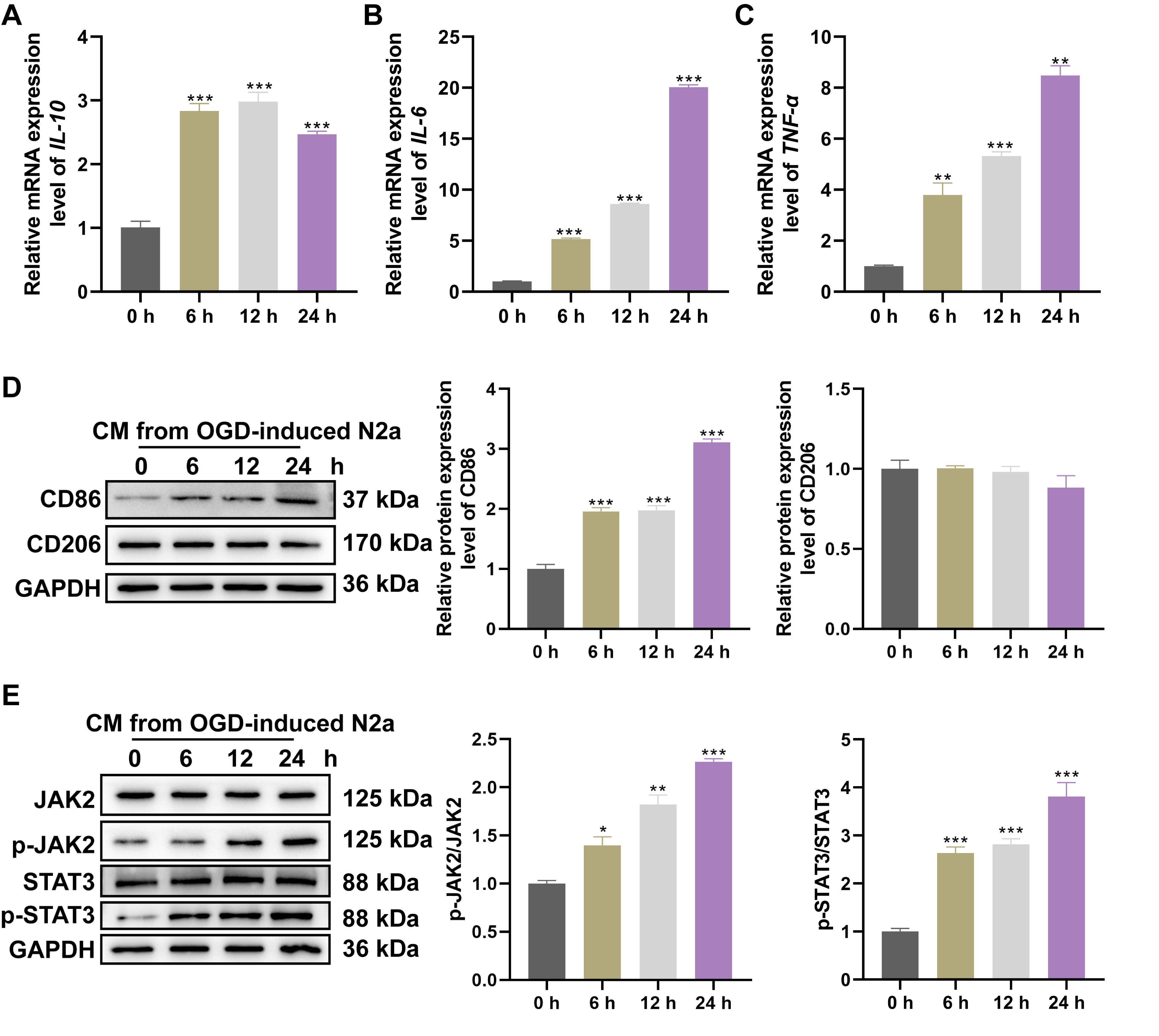 Fig. 1. CM collected from OGD neuron induced microglia polarization and inflammatory responses via JAK2/STAT3 activation. After stimulating BV2 cells with CM collected from N2A cells exposed to OGD for 0, 6, 12 and 24 hrs, relative levels of (A) IL-10, (B) IL-6, (C) TNF-