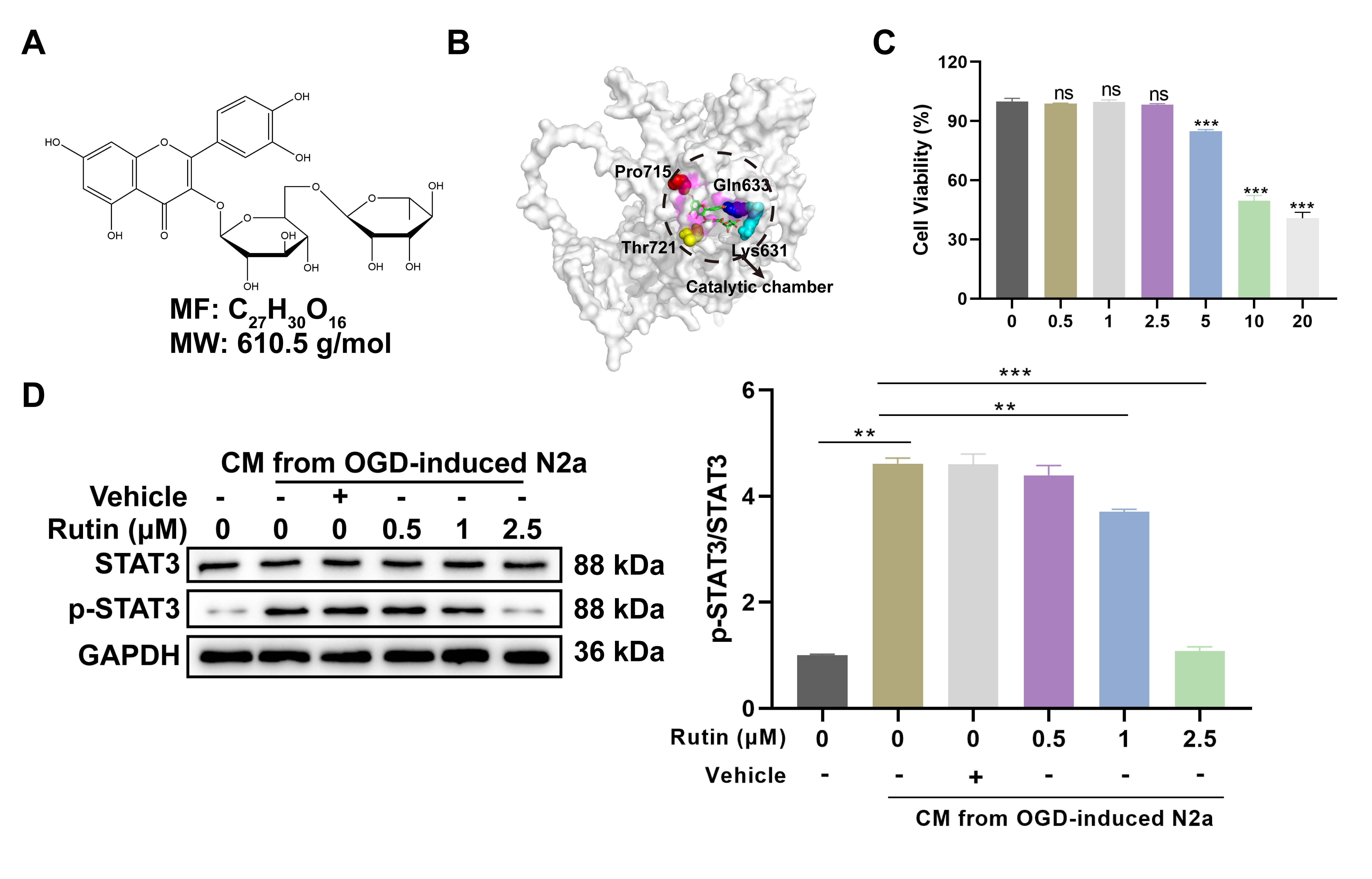 Fig. 2. Rutin inhibits STAT3 activation-induced by CM from OGD-treated neurons in microglia. (A) Chemical structure of rutin (C72H30O16) with a molecular weight of 610.5 g/mol. (B) Molecular docking of rutin and STAT3 protein. (C) After 24 hrs incubation with various concentrations of rutin (0, 0.5, 1, 2.5, 5, 10 and 20 µM), cell viability assay of BV2 microglial cells was evaluated and (D) Western blot analysis was conducted to determine the STAT3 phosphorylation in BV2 cells treated with non-toxic concentrations of rutin (0, 0.5, 1, 2.5 µM) for 24 hrs with CM stimulation. Data are presented as Mean