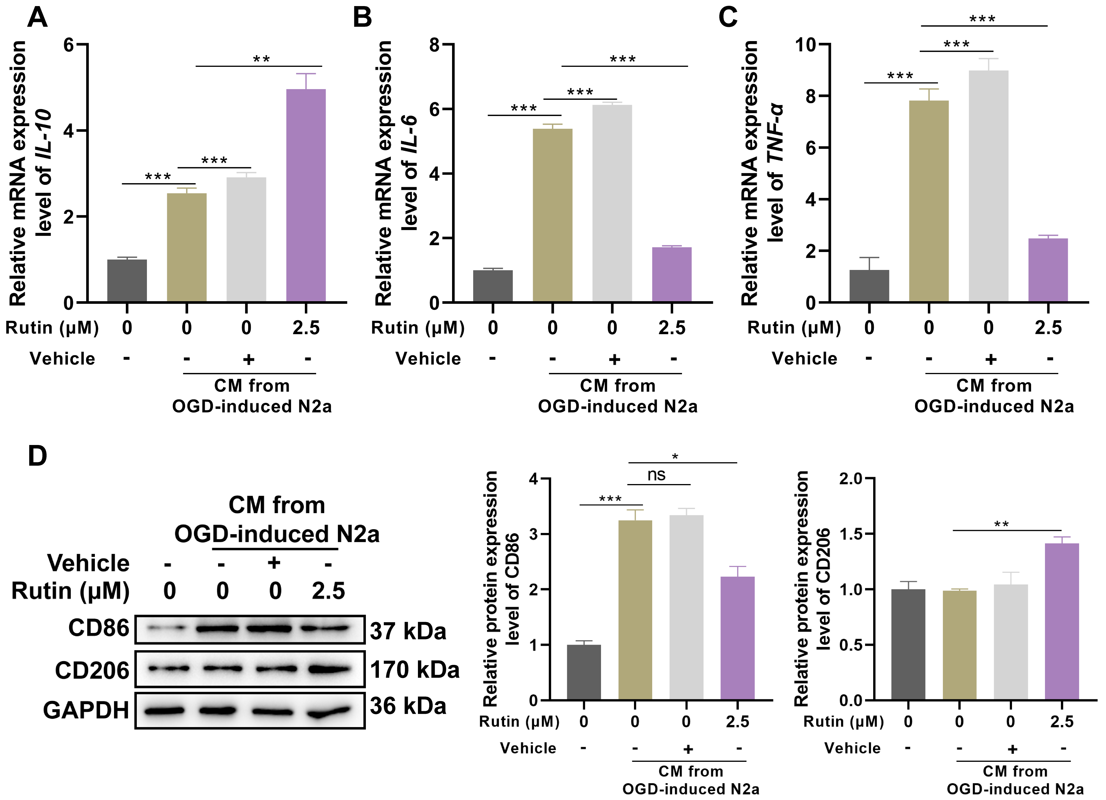 Treatment with 2.5 µM rutin in BV2 microglial cells exposed to CM from OGD-treated N2A neurons was associated with significant alterations in inflammatory cytokine profiles and microglial activation markers. Real-time PCR analysis demonstrated a marked increase in the expression of the anti-inflammatory cytokine IL-10 following rutin treatment compared to control and vehicle-treated groups (Fig. 3A). Additionally, the addition of rutin reversed the upregulation of pro-inflammatory cytokines IL-6 (Fig. 3B) and TNF-