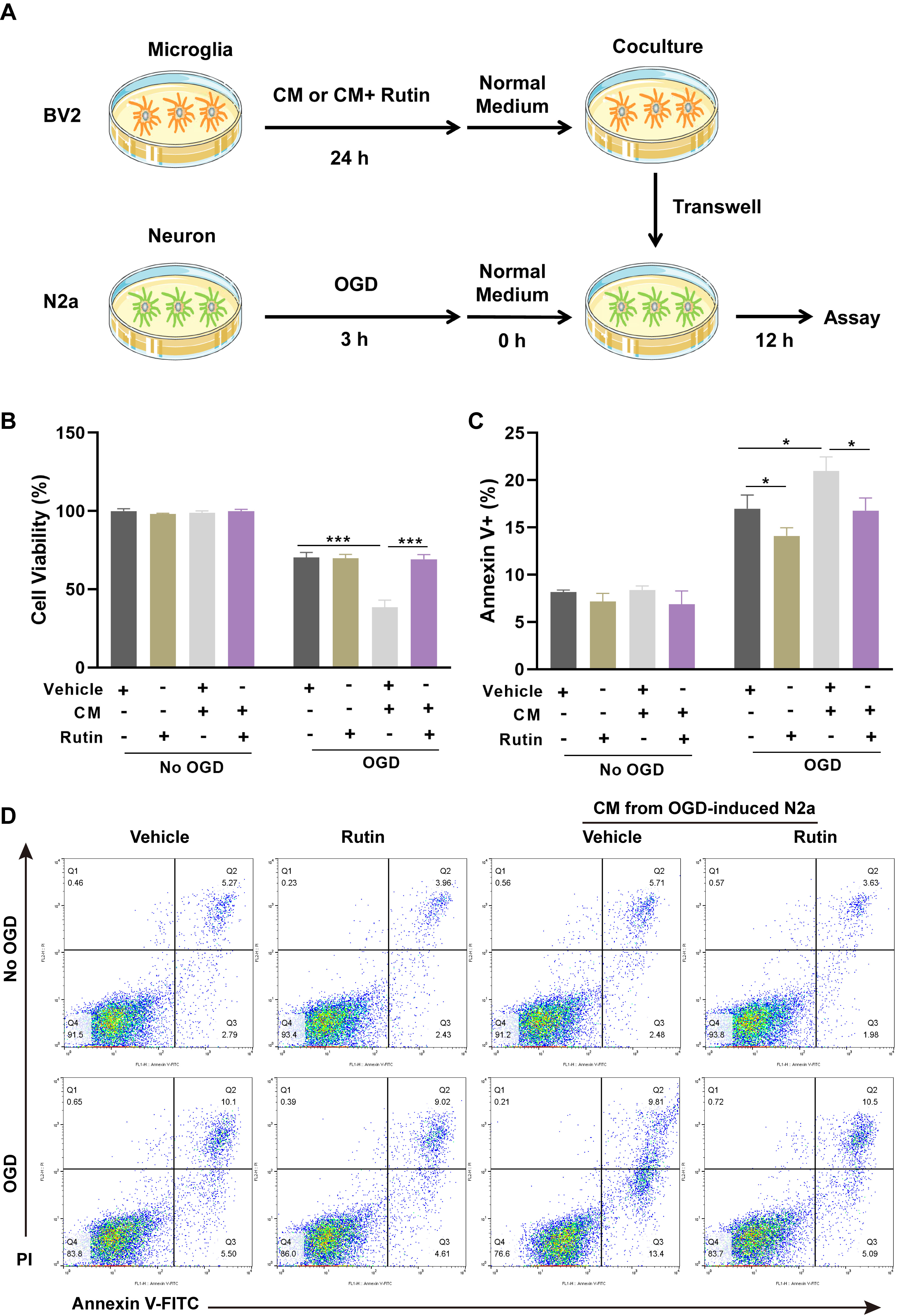 Fig. 4. Rutin abolishes the neurotoxic effect of pro-inflammatory microglia in cocultured neurons. (A) Schematic representation of the experimental schedule for co-culturing BV2 microglial cells and OGD-challenged N2A neurons. Microglia were treated with CM alone or supplemented with vehicle or rutin for 24 hrs, followed by a 12 hrs co-incubation with OGD-treated neurons. (B) After co-incubation, the cell viability of neurons was detected by CCK-8 assay. (C) Apoptosis in neurons was demonstrated by Annexin V/PI staining and (D) Annexin V-FITC apoptosis assay. Data are presented as Mean