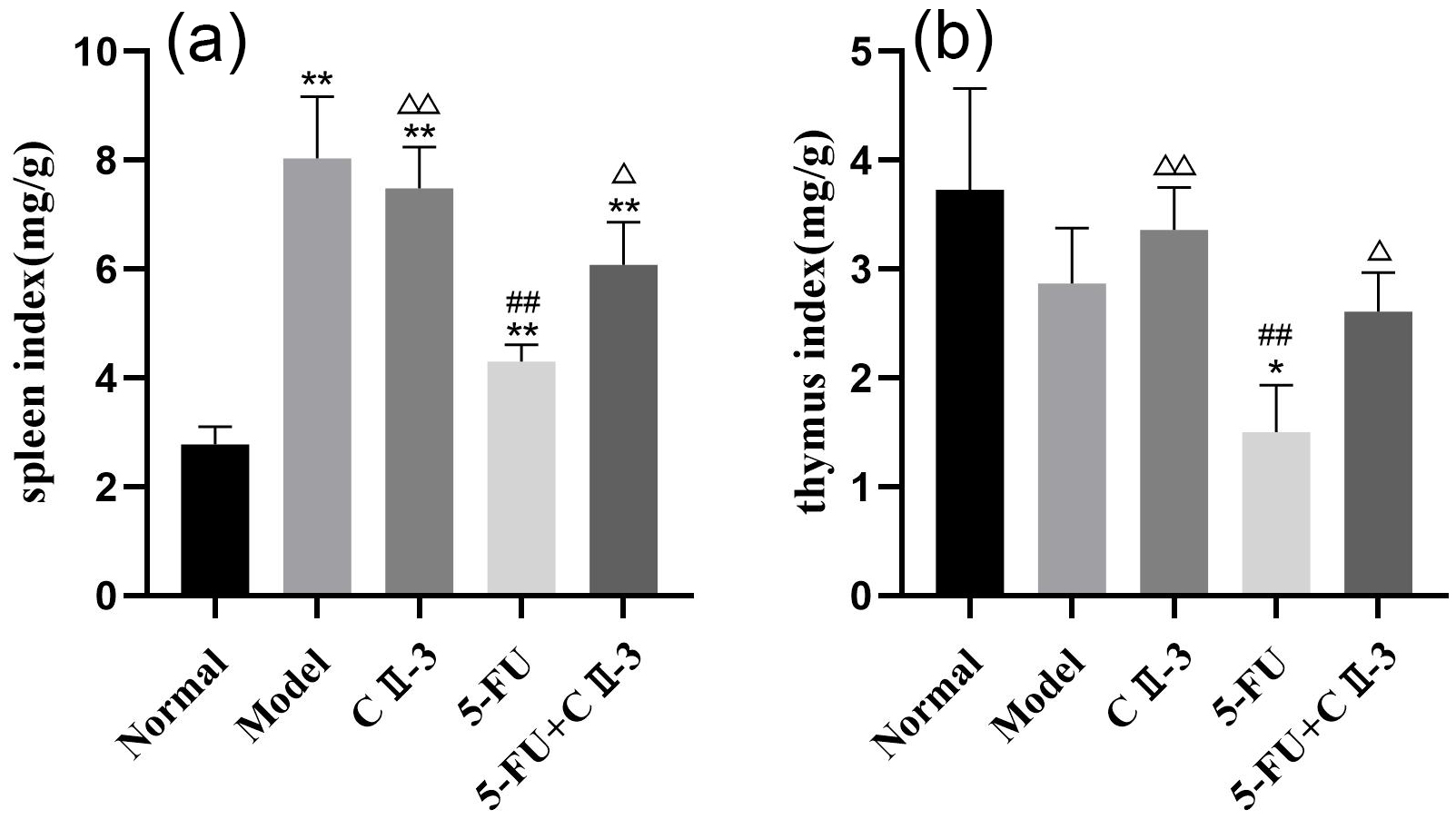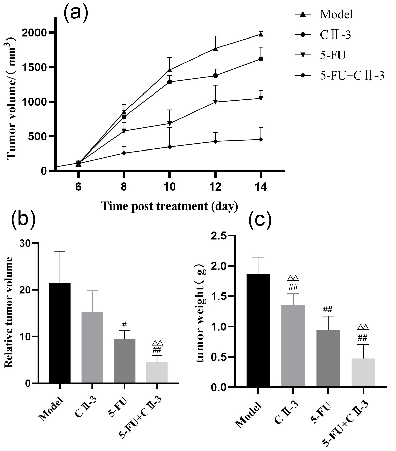 Apart from the normal group, tumor-bearing mice were randomly divided into the model group, CII-3 125 mg/kg group, 5-Fluorouracil (5-FU) 45 mg/kg group and 5-FU 45 mg/kg+CII-3 125 mg/kg group. The blank and model groups received intragastric saline and intraperitoneal injection of 5-FU, while the CII-3 group received intragastric administration of 125 mg/kg CII-3 once a day. The combination group received both 125 mg/kg CII-3 orally and intraperitoneal injection of 45 mg/kg 5-FU every 2 days.