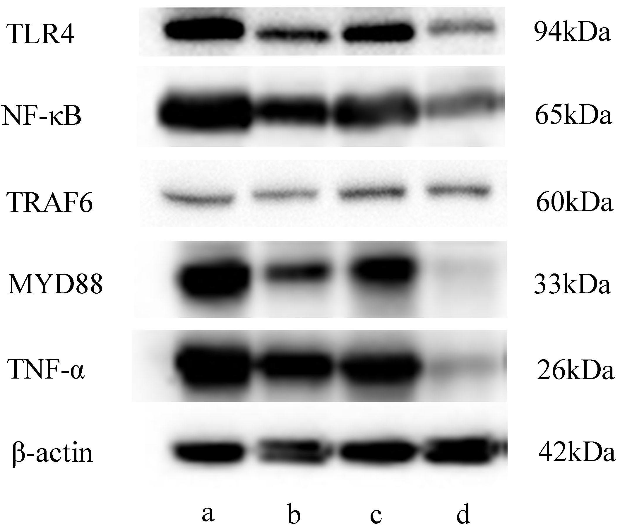 Fig. 11. Changes in expression of, (a) TLR4, (b) TRAF6, (c) MYD88, (d) NF-
