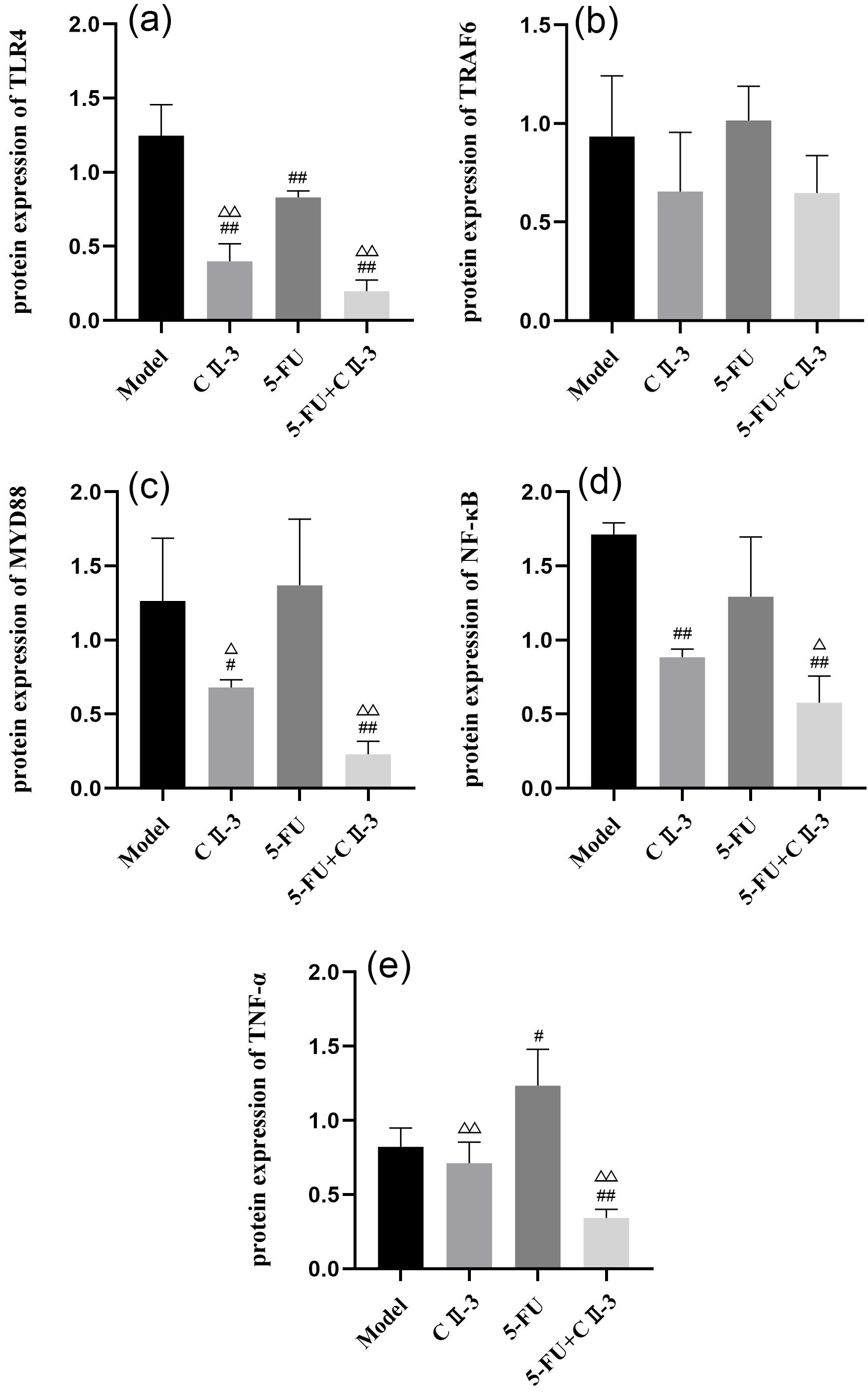 The CII-3 and 5-FU combined treatment synergistically exerts anti-tumor and immunomodulatory effects, potentially mediated through the regulation of TLR4, NF-κB, TRAF6, MyD88, and TNF-α.