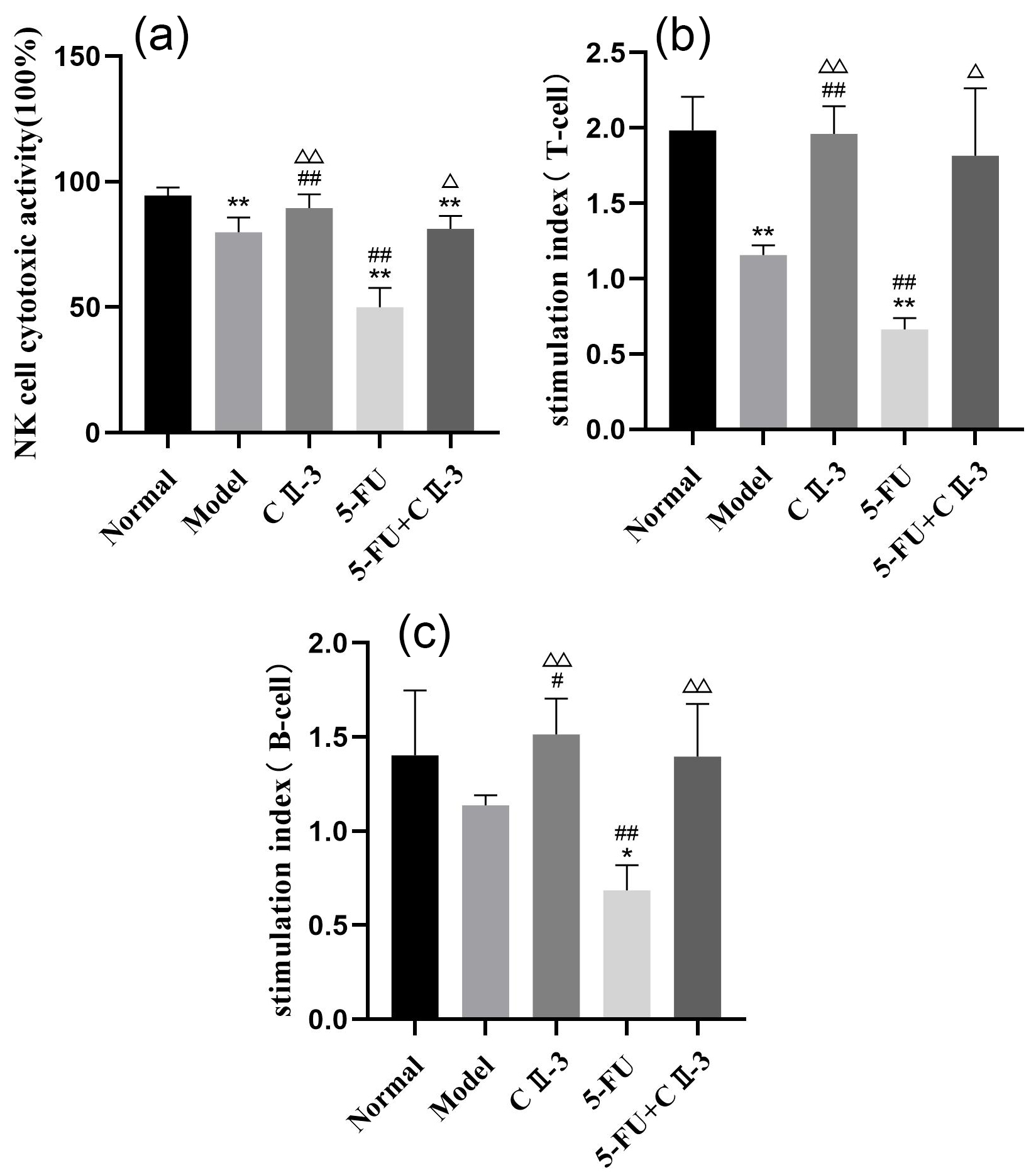Secondly, under the context of 5-FU treatment for liver cancer, the impact on the host immune system becomes a critical consideration. Current experimental results indicated that the combination of 5-FU and CII-3 has a pronounced regulatory effect on the murine immune system, particularly on immune cells and factors. Elevated levels of IgA, IgM and IgG in the 5-FU combined with CII-3 group suggest a potential role of CII-3 in modulating humoral immunity, enhancing the body’s defense against infections. Moreover, significant changes were observed in the quantity and activity of immune cells after 5-FU treatment. The NK cells, crucial for nonspecific immune activity, play a vital role in overall immune function [34]. The activation of immune cells is also part of the inflammation in liver cancer [35]. Current results demonstrate that CII-3 can enhance the cytotoxic activity of NK cells, potentially compensating for the inhibitory effect of 5-FU on NK cell activity. This discovery provides a new mechanistic explanation for the immunomodulatory effects of 5-FU combined with CII-3 treatment. The T lymphocytes, especially CD3+, CD4+ and CD8+ cells, may decrease after 5-FU treatment, leading to an imbalance in T lymphocyte subgroups. This aligns with previous research results, indicating the direct impact of chemotherapy drugs on T lymphocytes.