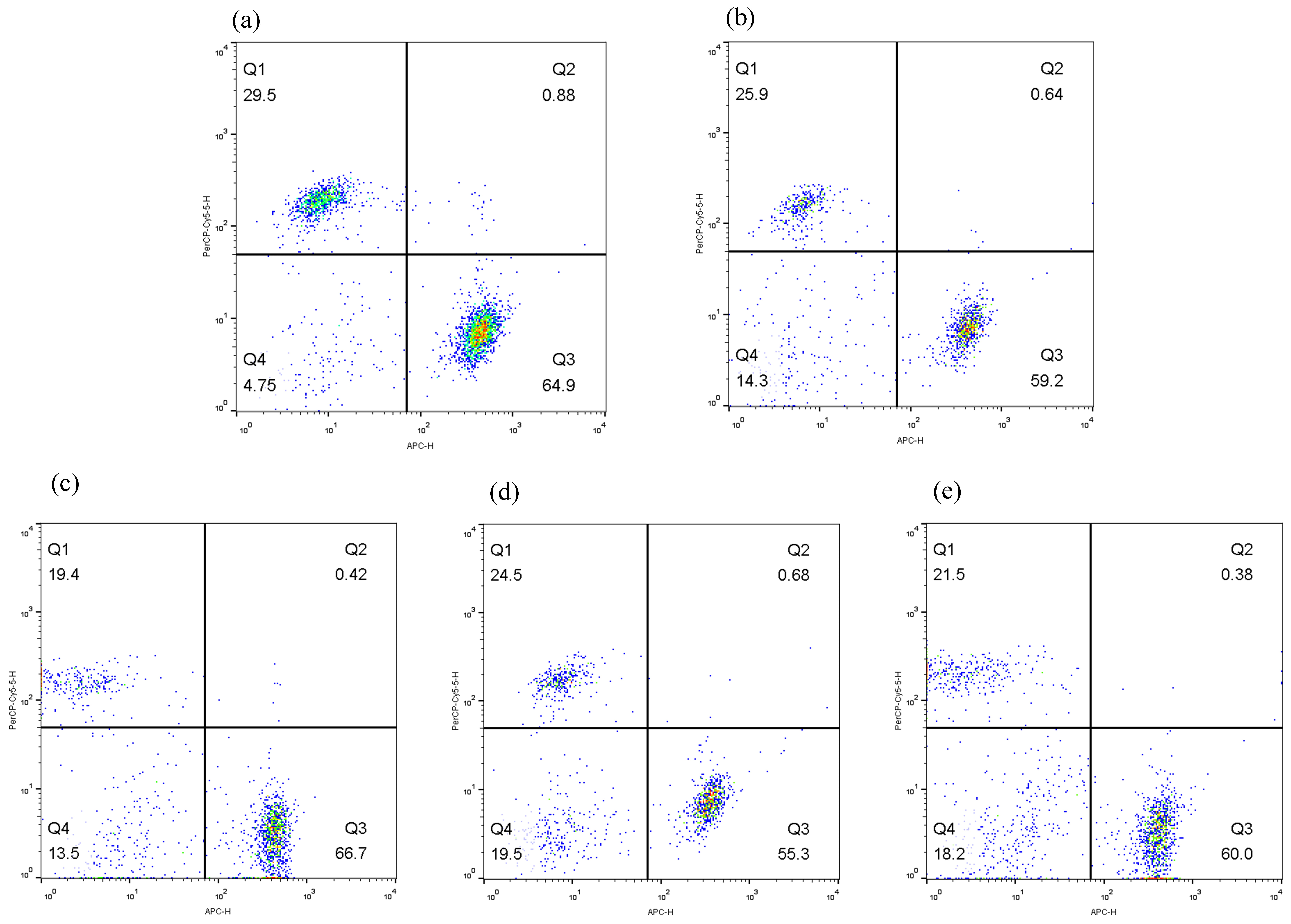 Fig. 6. Flow cytogram of CD3+, CD4+ and CD8+ cells. (a) Normal, (b) Model, (c) CII-3, (d) 5-FU and (e) 5-FU+CII-3. n = 6.