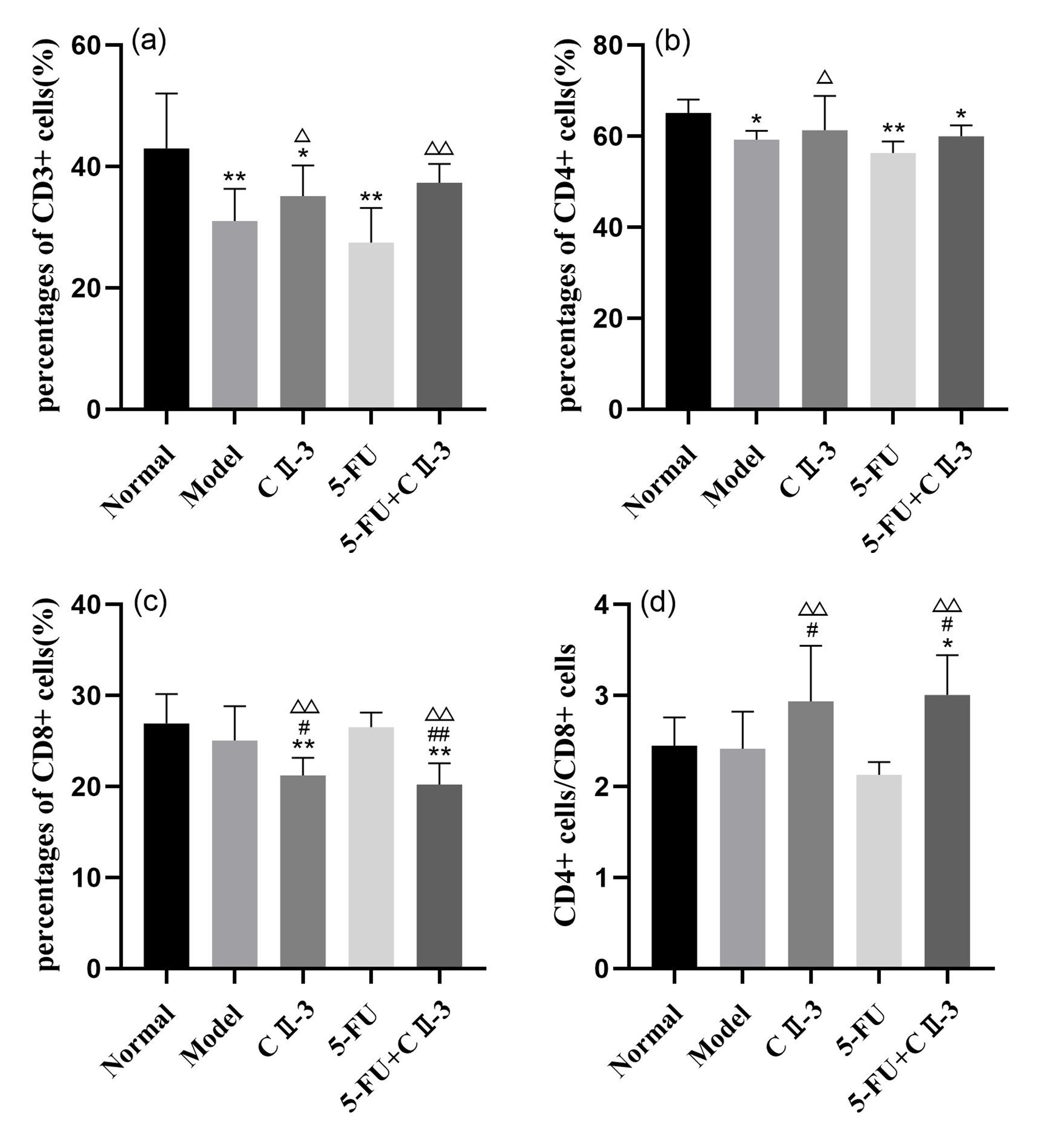 Fig. 6 shows the results of flow cytometry experiments. As shown in Fig. 7, compared to the normal group, the CD3+ (Fig. 7a) and CD4+ (Fig. 7b) cell proportions in both the model group and the 5-FU group significantly decreased (p