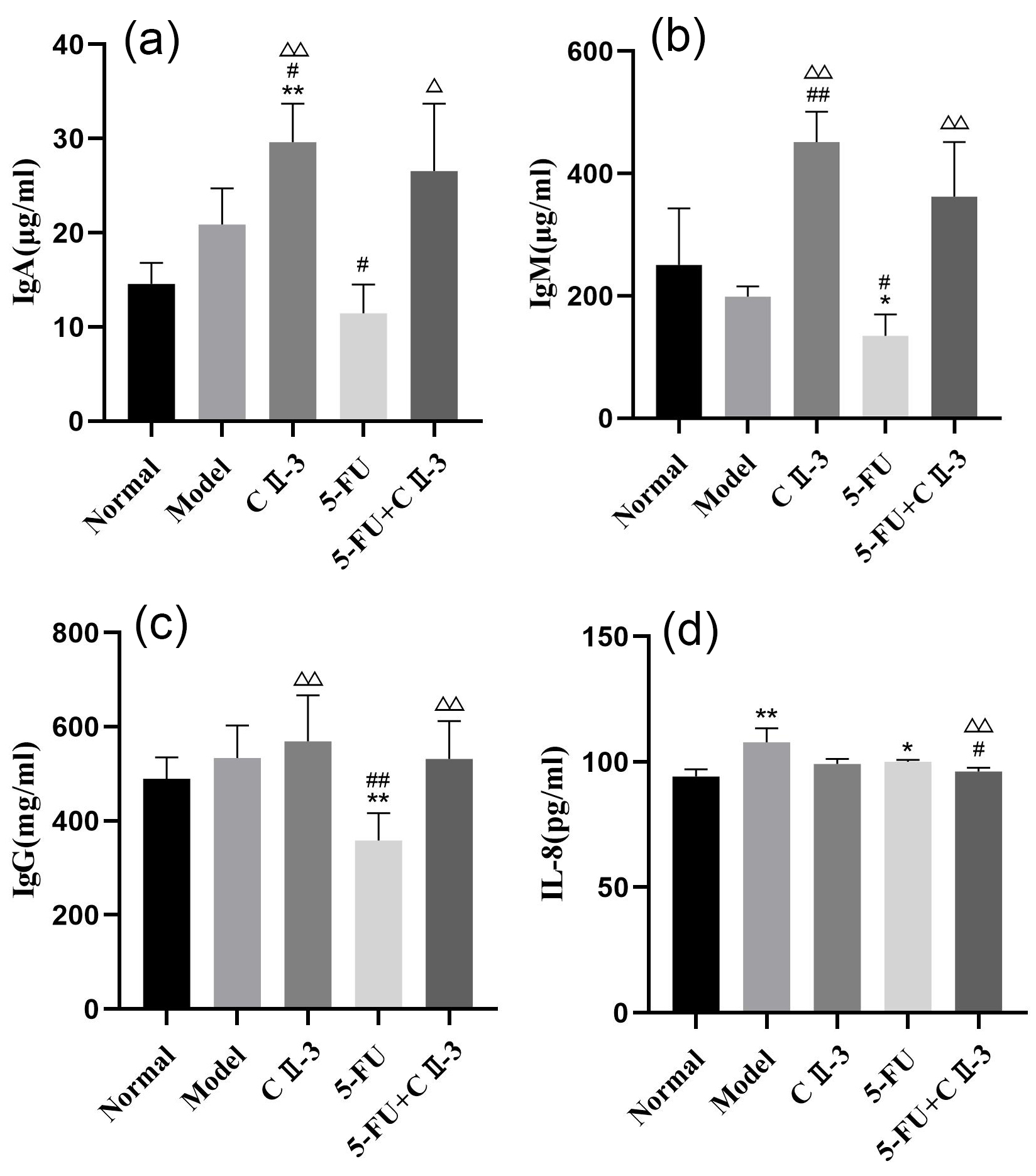 As shown in Fig. 8a–c, compared to the model group, the levels of IgA, IgM and IgG in the serum of the 5-FU group mice all decreased (p