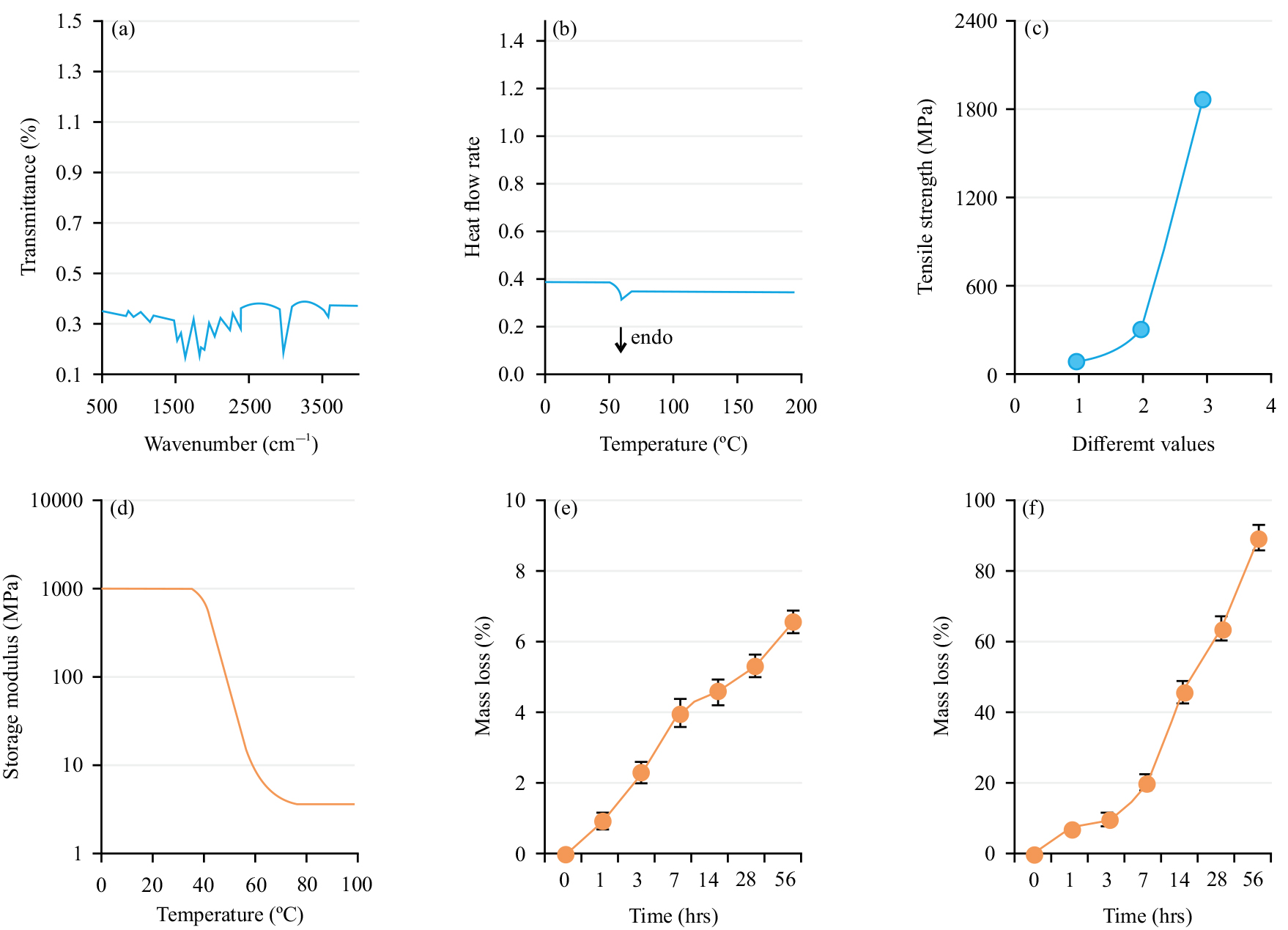 Fig. 1. Physicochemical properties of Metoprolol-loaded poly (lactic-co-glycolic acid)-poly (trimethylene carbonate)-poly (glycolic acid) drug-eluting stent (Meto-PLGA/PTMC DES). (a) Fourier Transform Infrared Spectroscopy (FTIR) spectrum; (b) Differential Scanning Calorimetry (DSC) curve; (c) Static mechanical properties (the x-axis labels 1, 2, and 3 represent the mass ratios of PLLA:PTMC:PGA as 1:1:1, 1:1:2 and 1:1:3, respectively); (d) Dynamic mechanical properties; (e) Weight loss versus time curve in water and (f) Weight loss versus time curve in proteinase K.