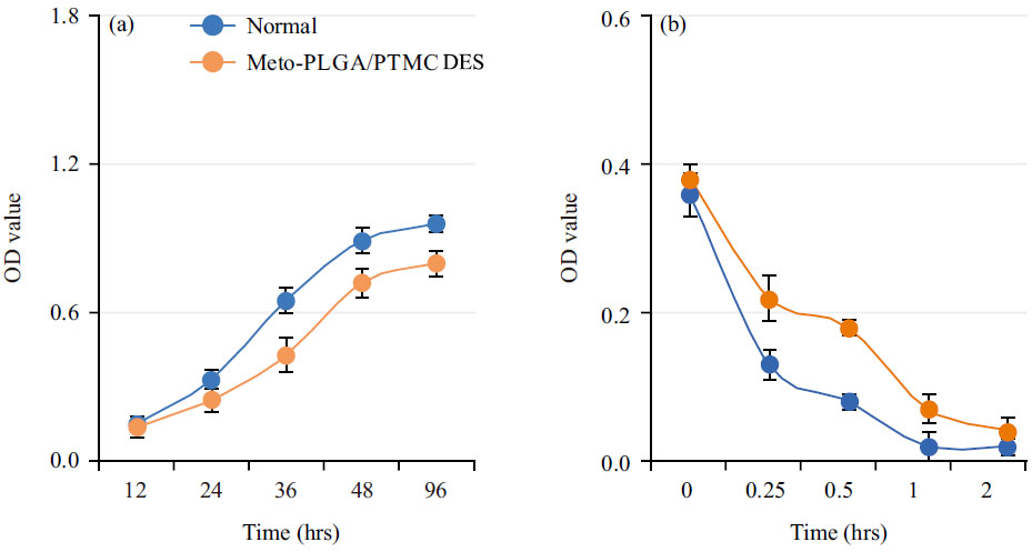 Fig. 2a shows the results of cell proliferation assays for rabbit cardiac fibroblasts cultured in a normal medium and in extracts from Meto-PLGA/PTMC DES. Over time, proliferation activity increased markedly in both conditions, with higher proliferation in the normal medium. The effect of Meto-PLGA/PTMC DES on cell proliferation was minimal, indicating good cytocompatibility and absence of cytotoxicity. The hemolysis rate of Meto-PLGA/PTMC DES was 3.09%, which was below the 5% threshold, indicating that the composite materials meet the hemolysis requirements for medical biomaterials. Fig. 2b presents the dynamic clotting time curve for Meto-PLGA/PTMC DES, which shows a similar gradual decrease as observed in the normal control, indicating comparable clotting behavior.