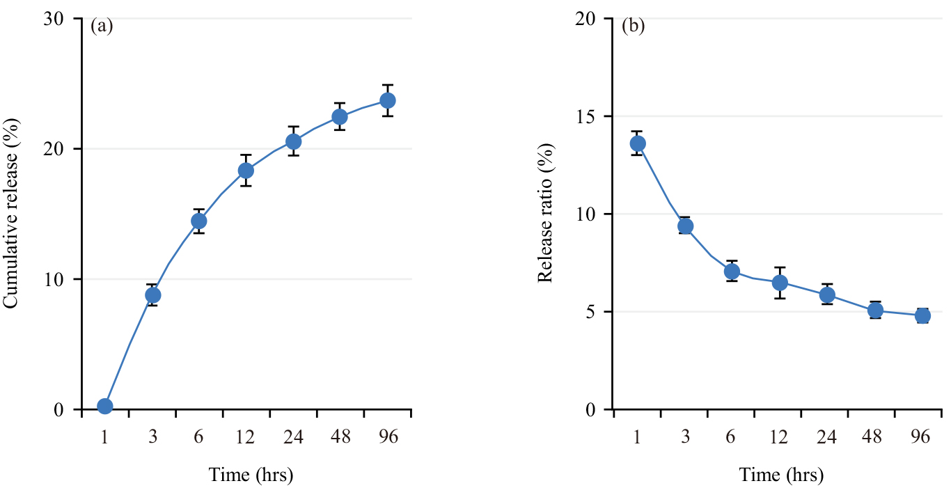 Fig. 3. In vitro drug release characteristics of Metoprolol-loaded poly (lactic-co-glycolic acid)-poly (trimethylene carbonate)-poly (glycolic acid) drug-eluting stent (Meto-PLGA/PTMC DES). (a) Cumulative drug release rate and (b) Amount of drug released.