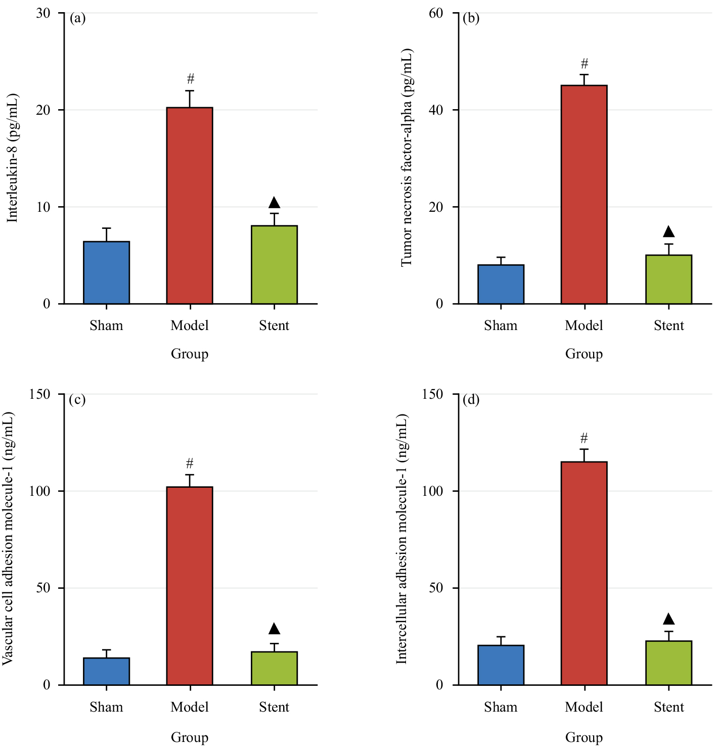 Post-treatment, 3 mL of venous blood was collected from the ear margin using a 5 mL disposable syringe (Catalog No. 100500, Shanghai Kohama Medical Devices Co., Ltd., Shanghai, China) with a 22G needle (Catalog No. 302220, BD Medical, Franklin Lakes, NJ, USA), anticoagulated with heparin sodium (Catalog No. H3149, Sigma-Aldrich, St. Louis, MO, USA) at a final concentration of 10 U/mL and centrifuged at 1200 rpm for 10 min using a centrifuge (Catalog No. 5810R, Eppendorf AG, Hamburg, Germany).The supernatant was utilized to measure serum Interleukin-8 (IL-8) levels via radioimmunoassay using an IL-8 radioimmunoassay kit (Catalog No. RK00012, Shanghai Enzyme Linked Bio, Shanghai, China), while serum Vascular Cell Adhesion Molecule-1 (VCAM-1), Intercellular Adhesion Molecule-1 (ICAM-1) and Tumor Necrosis Factor-Alpha (TNF-
