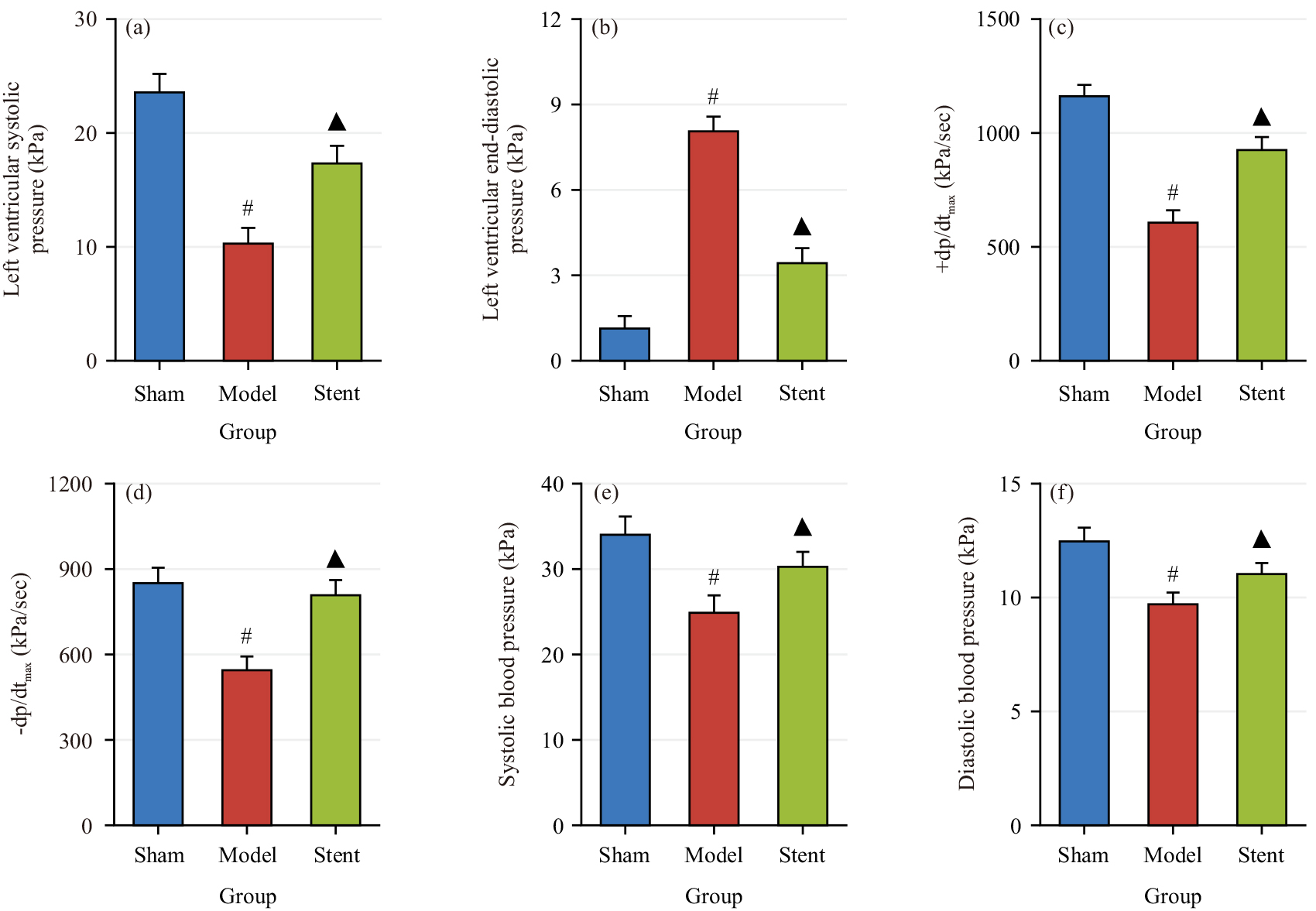 Fig. 5. Comparison of cardiac function parameters across groups. (a) Left Ventricular Systolic Pressure (LVSP); (b) LV end-diastolic pressure (LVEDP); (c) +dp/dtmax; (d) –dp/dtmax; (e) systolic blood pressure (BPs) and (f) diastolic BP (BPd). #p